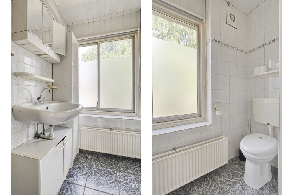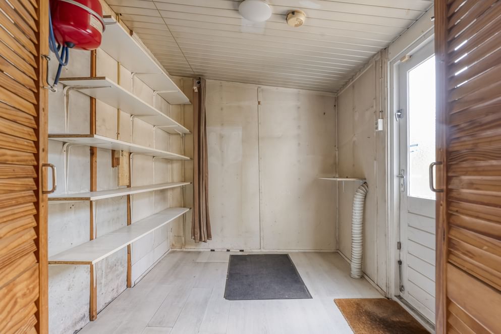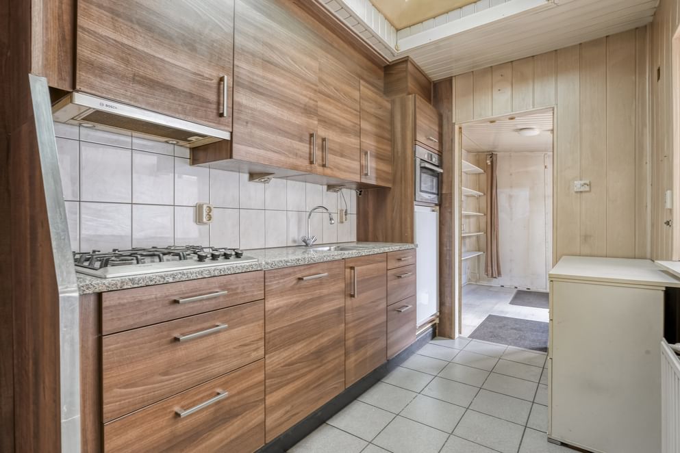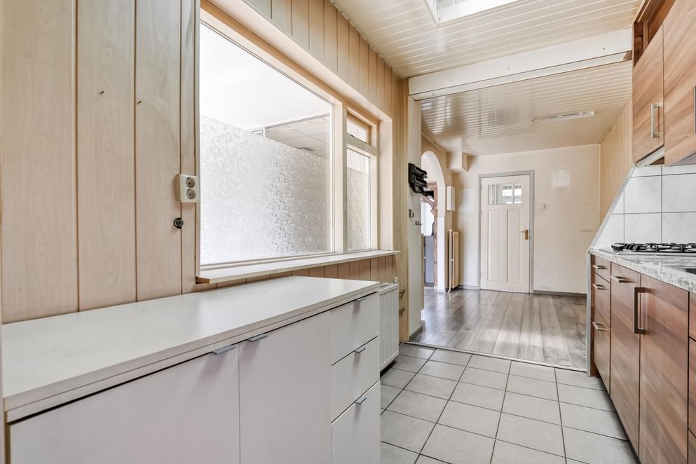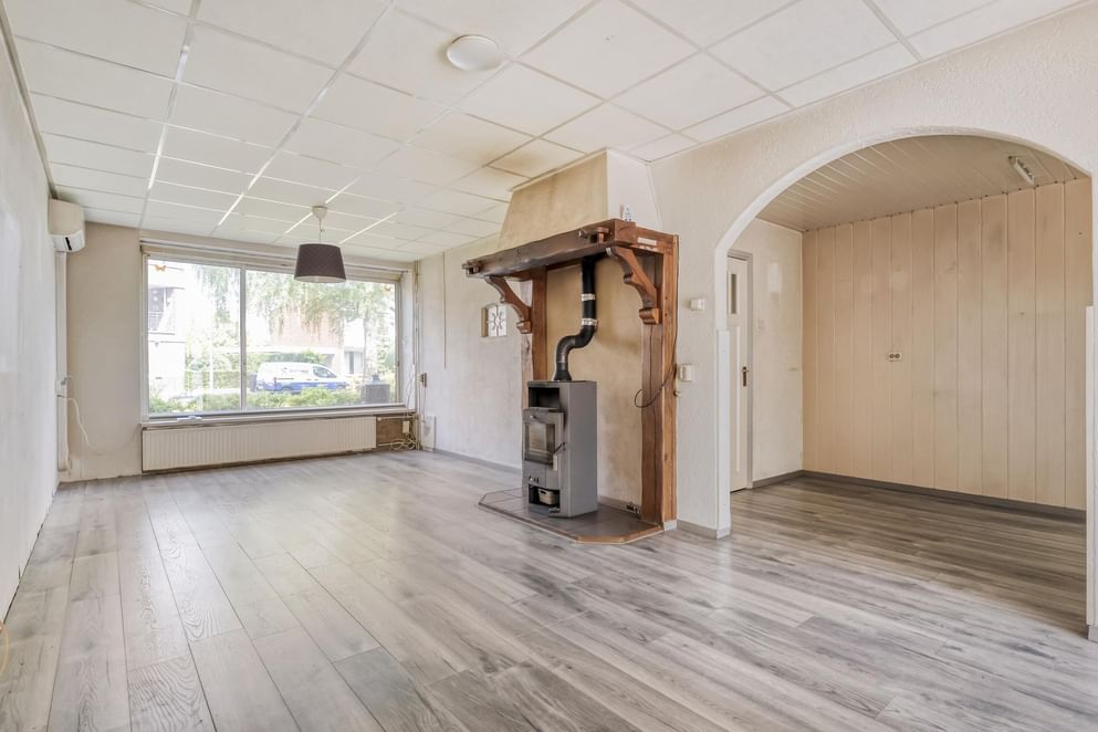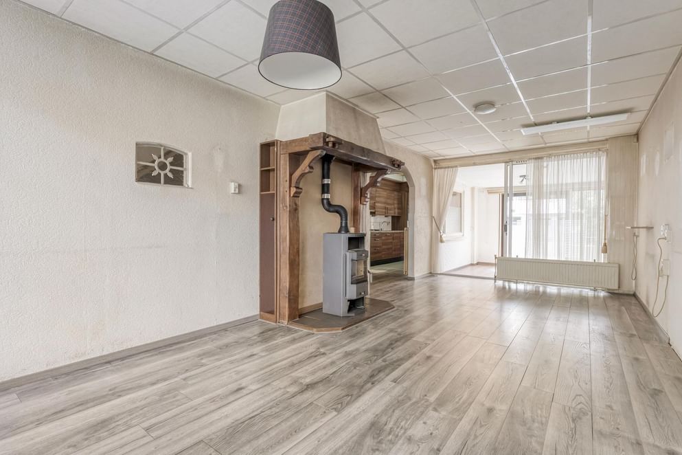De begane grond voelt direct ruim aan, mede dankzij de uitbouw van maar liefst 12 m² die zorgt voor extra leefruimte en comfort. De woonkamer is voorzien van een gezellige houtkachel en airconditioning, waardoor het hier het hele jaar door aangenaam is. Rolluiken aan de voorzijde zorgen voor extra privacy en isolatie. De keuken is functioneel ingericht met een stenen werkblad, spoelbak, 4-pits gasfornuis en een vaatwasser. Achterin de woning bevindt zich nog een bijkeuken, ideaal als extra bergruimte of wasruimte.
