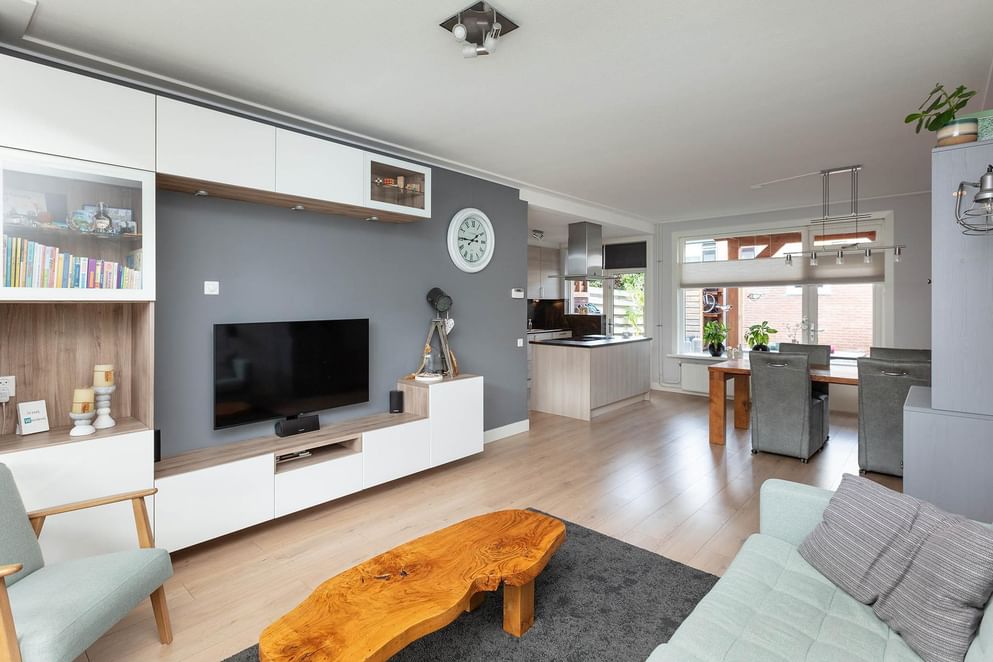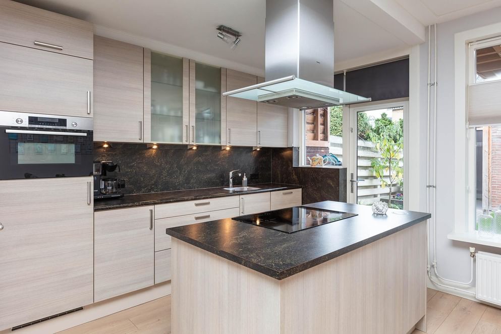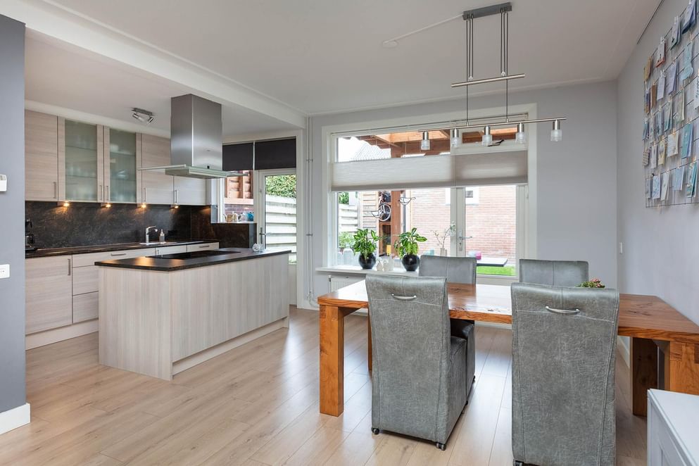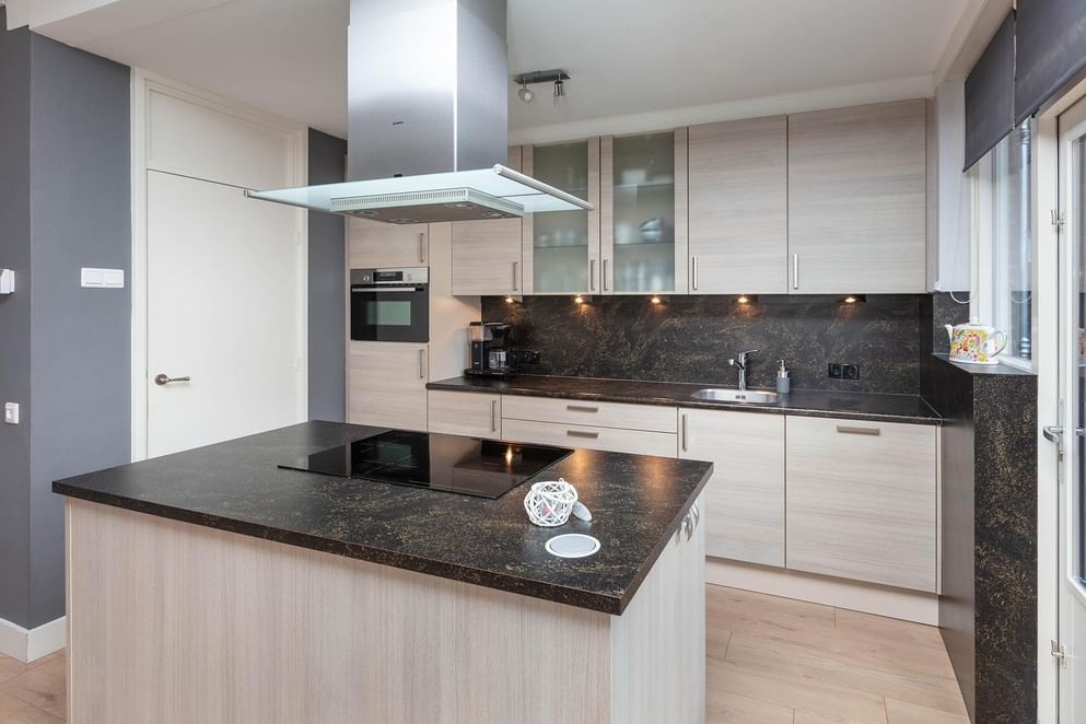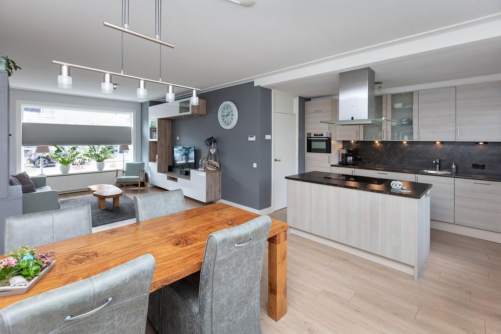 De open keuken is voorzien van een modern uitgevoerde unit en een kookeiland uitgerust met diverse inbouwapparatuur, waaronder een combi-oven (2018), inductiekookplaat (2019), vaatwasser, afzuigkap, spoelbak en een koelkast. De leefruimte beschikt over twee enkele deuren waarmee je toegang hebt tot de achtertuin.
