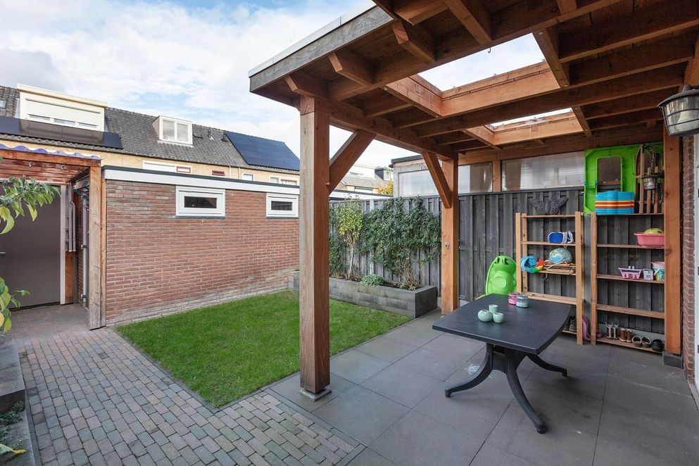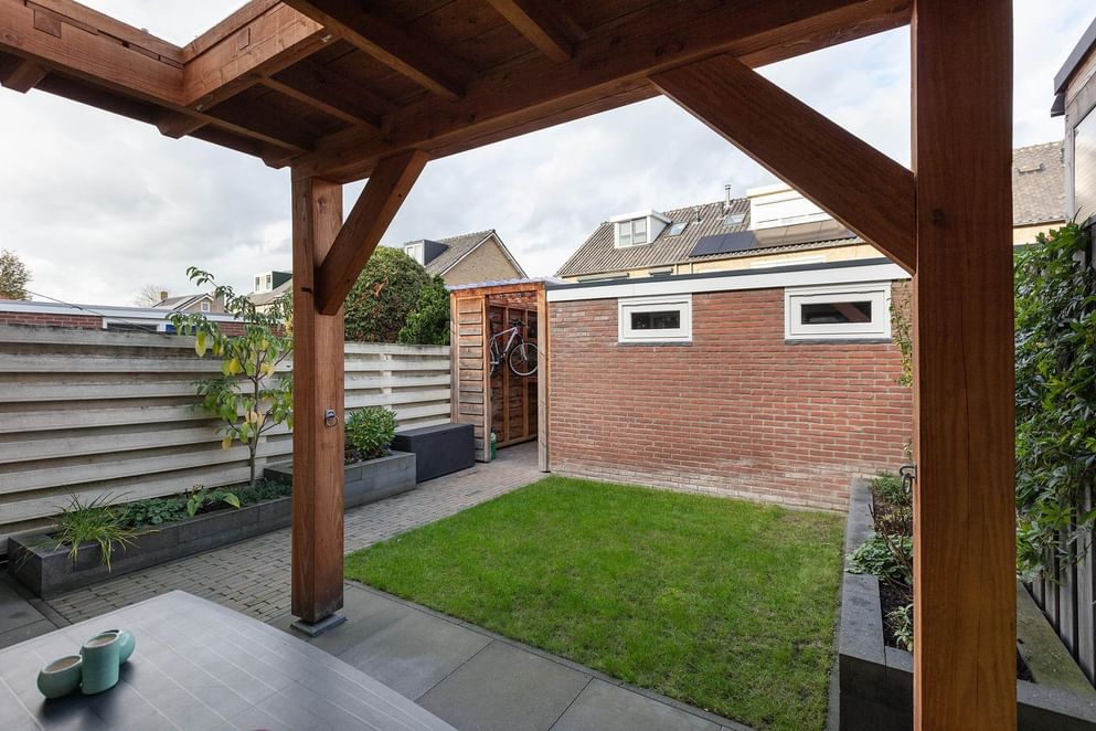 Onderhoudsarme achtertuin op het noorden voorzien van een houten overkapping met lichtstraten, een vrijstaande stenen berging en een achterom.