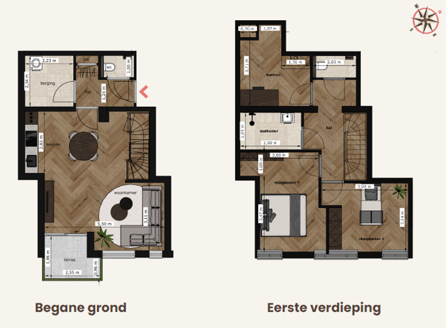 Boven vind je twee comfortabele slaapkamers en een ruime badkamer. Dankzij de efficiënte indeling heb je veel extra ruimte voor bijvoorbeeld een hobbykamer, kantoor of extra opbergruimte.