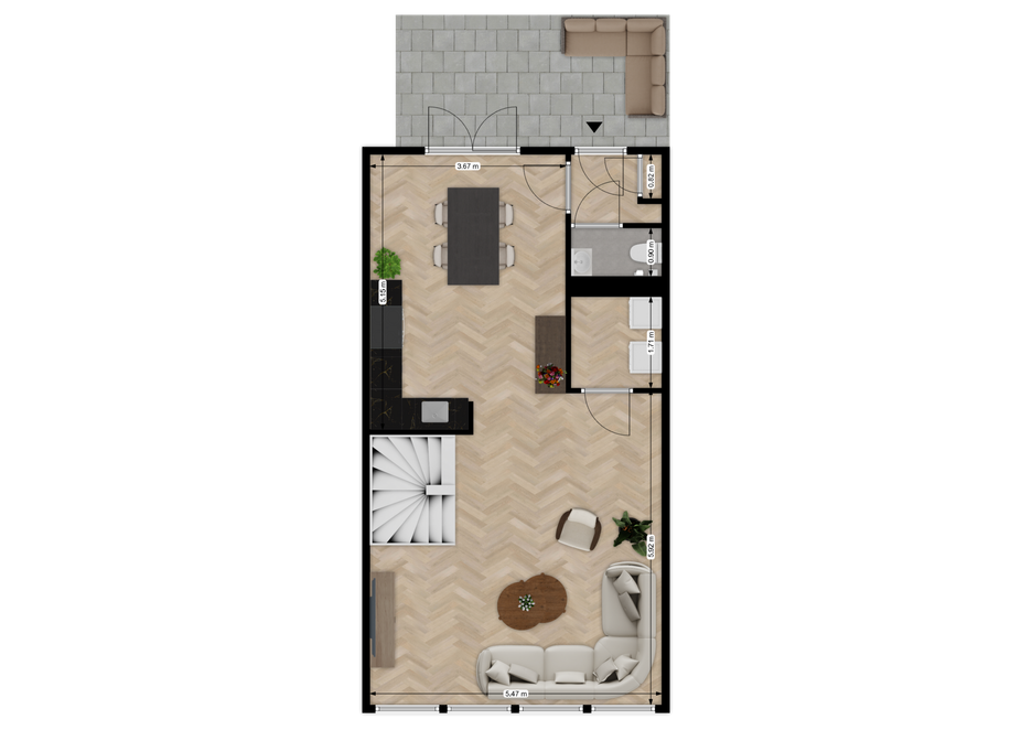 Bij binnenkomst in het appartement stap je een compacte hal binnen met een meterkast en toegang tot een separate toiletruimte. Vanuit hier loop je door naar de open leefruimte, waar de keuken, eethoek en woonkamer op een prettige manier samenkomen. In deze ruimte bevinden zich ook een trap naar de tweede verdieping en een praktische bijkeuken. De keuken kun je volledig naar eigen wens samenstellen met een keukencheque ter waarde van €7.000 (inbegrepen in de v.o.n.-prijs) Vanuit de keuken heb je via openslaande deuren toegang tot een balkon wat gunstig is gelegen op het westen.