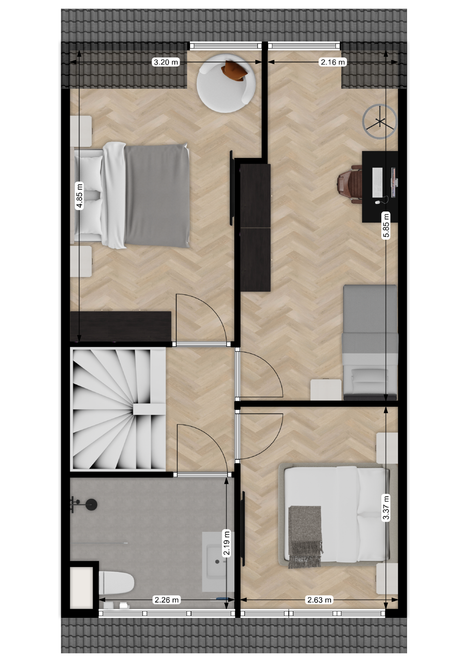 Via de trap bereik je de eerste verdieping, waar zich drie ruime slaapkamers en een volledig uitgeruste badkamer bevinden.