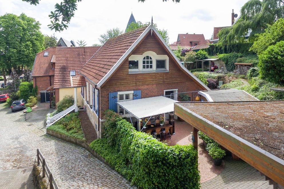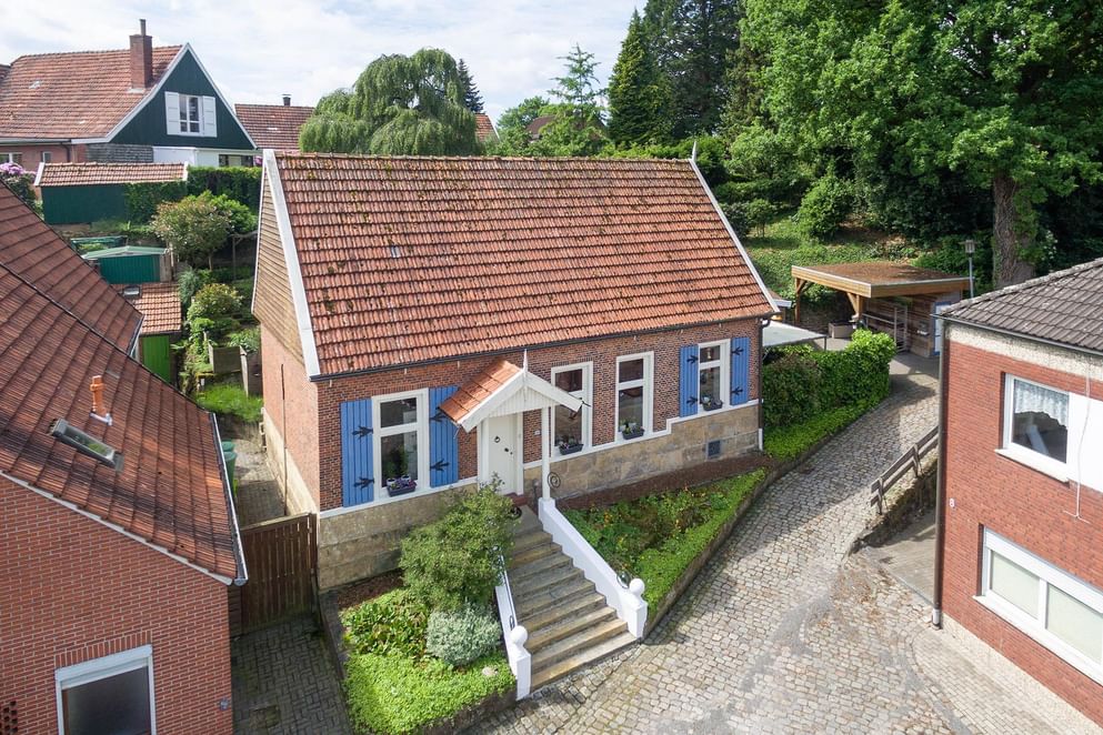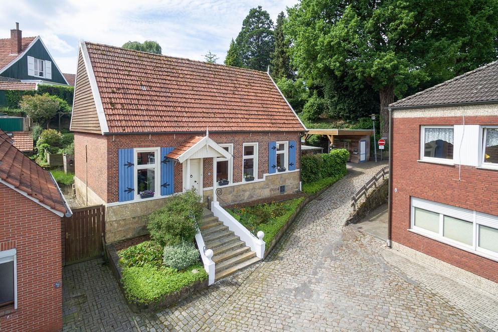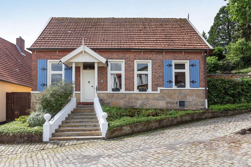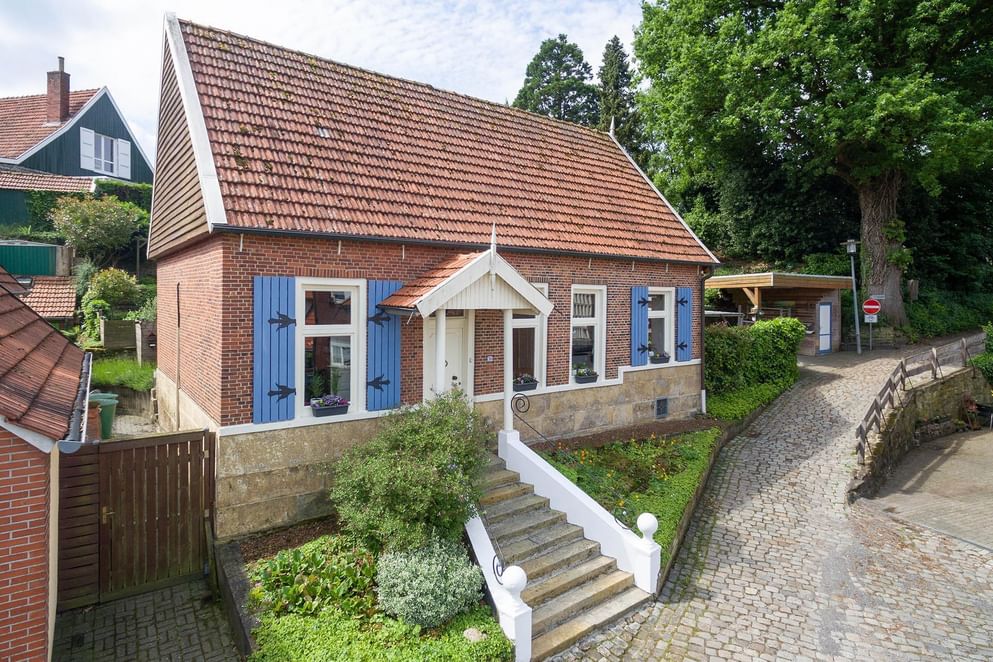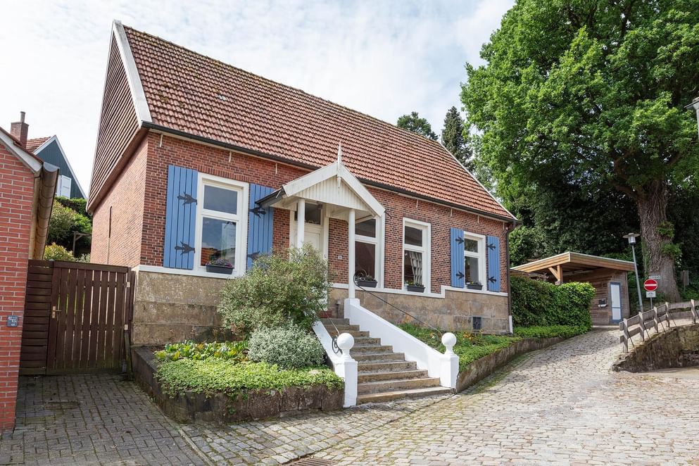 In en om het woonhuis ontbreekt het niet aan details. Het huis is gebouwd omstreeks 1900 en is door de jaren heen gerenoveerd en gemoderniseerd, waardoor eigentijdse gemakken nu samen gaan met de karakteristieke stijl. De woning valt op door de aquablauwe luiken langs de ramen en de niet te missen Bentheimer zandstenen trapopgang naar de voordeur. Daarnaast komt dezelfde steen weer terug in de onderste laag van de gevels. Het geheel is gelegen aan een hellend verkeersluw straatje met veel groen.