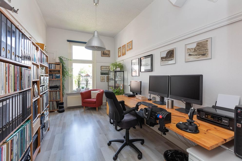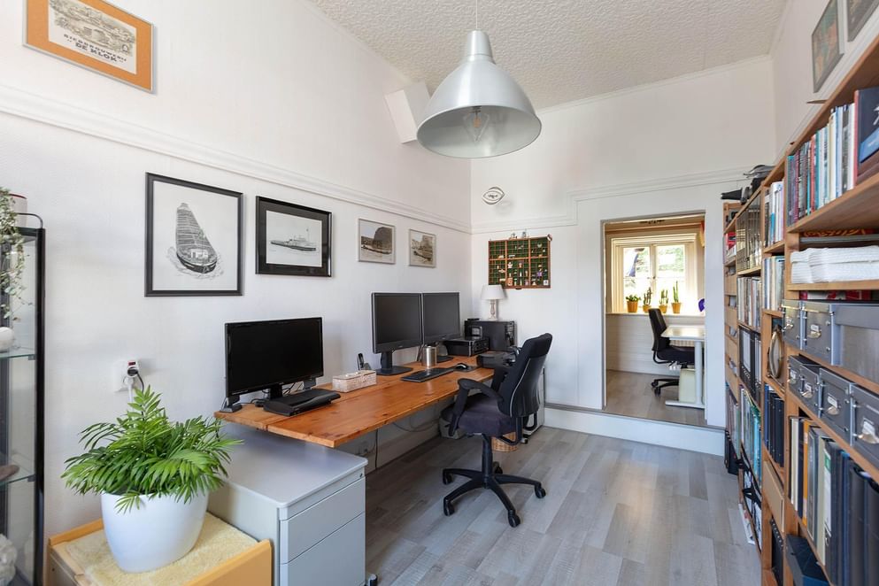 Tevens is vanuit de hal ook een kantoorruimte (opkamer) bereikbaar, deze ruimte zou ook prima als slaapkamer kunnen fungeren. Aangrenzend bevindt zich nog een kleinere kamer welke ook dienst doet als kantoor.