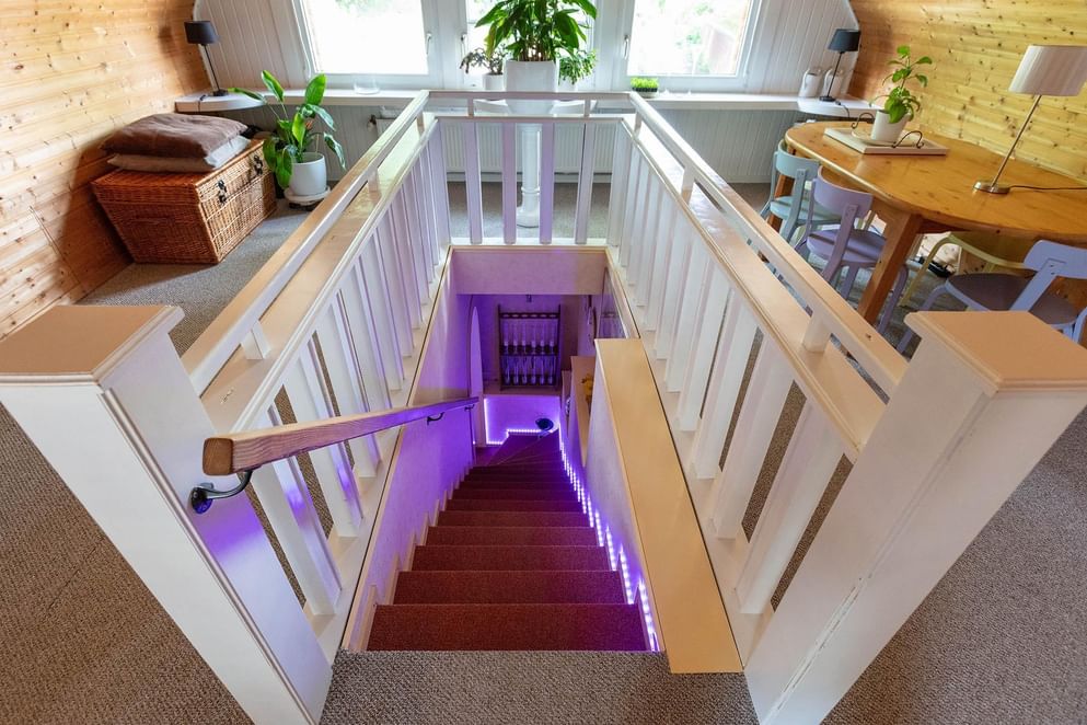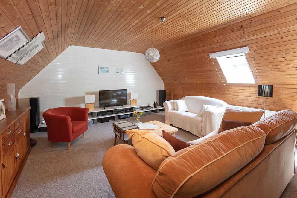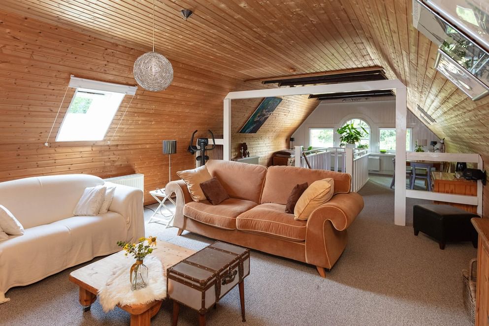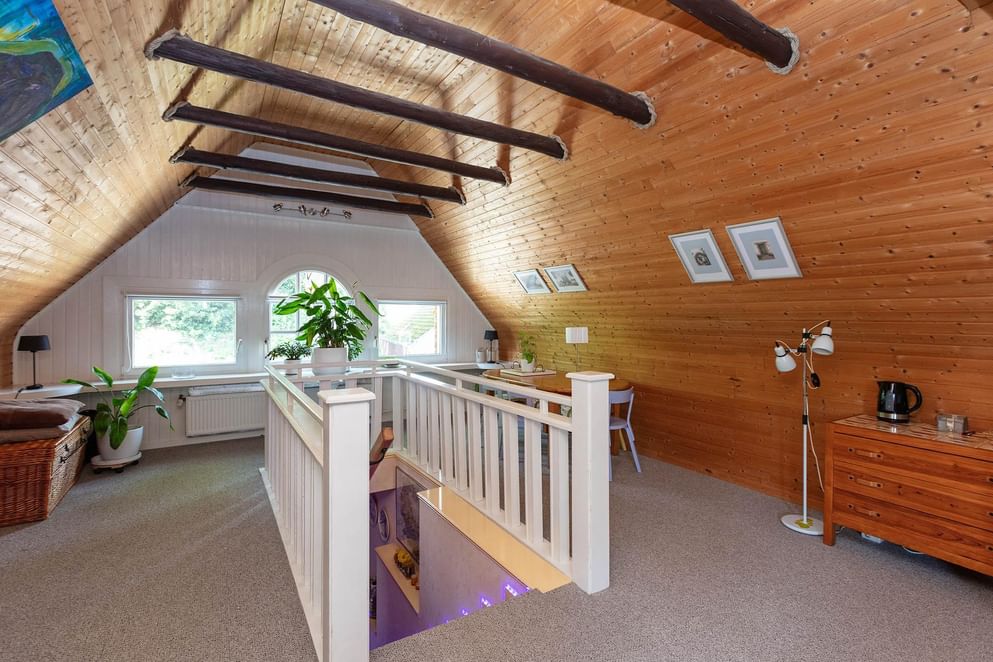 Via een vaste trap is de eerste verdieping te bereiken, dit is een open ruimte (studio) die gebruikt wordt als living. De sfeervolle ruimte beschikt over genoeg daglicht door de ramen in de zijgevel en het dakraam.