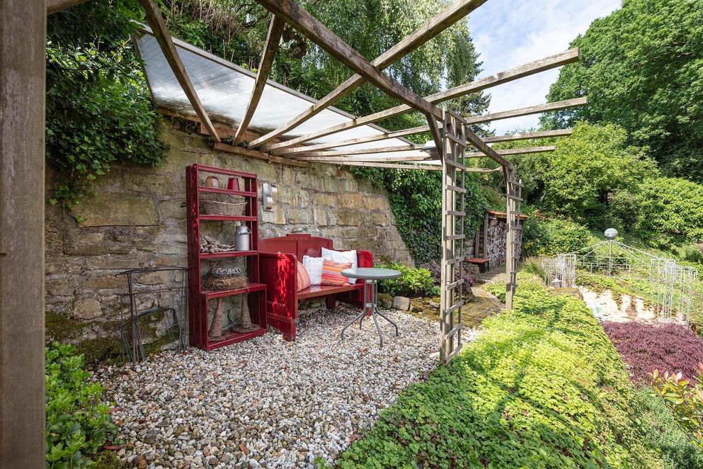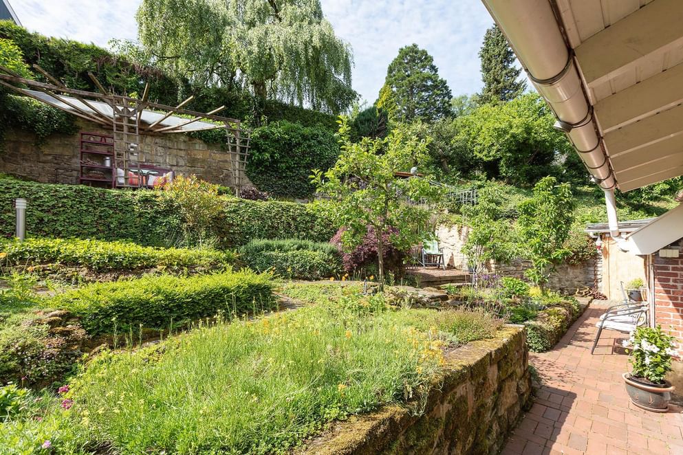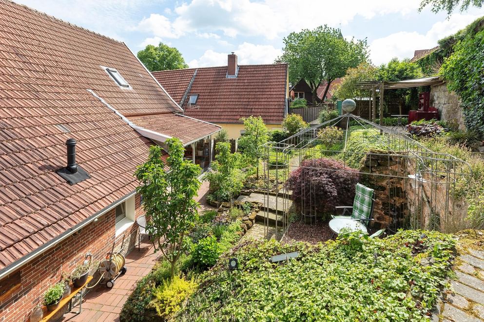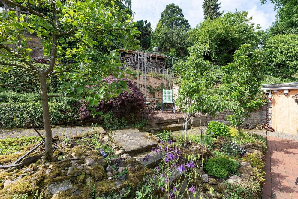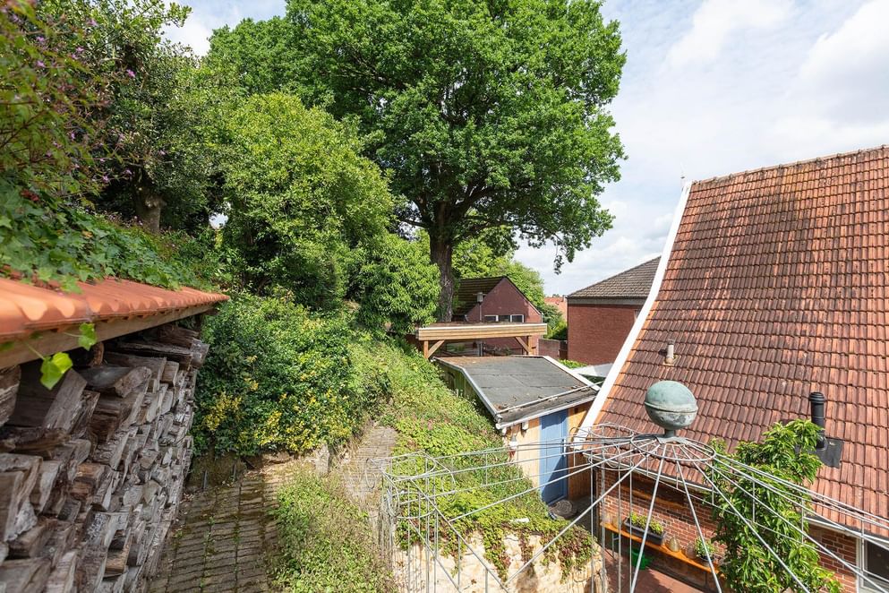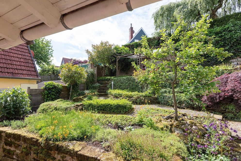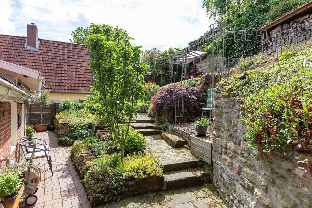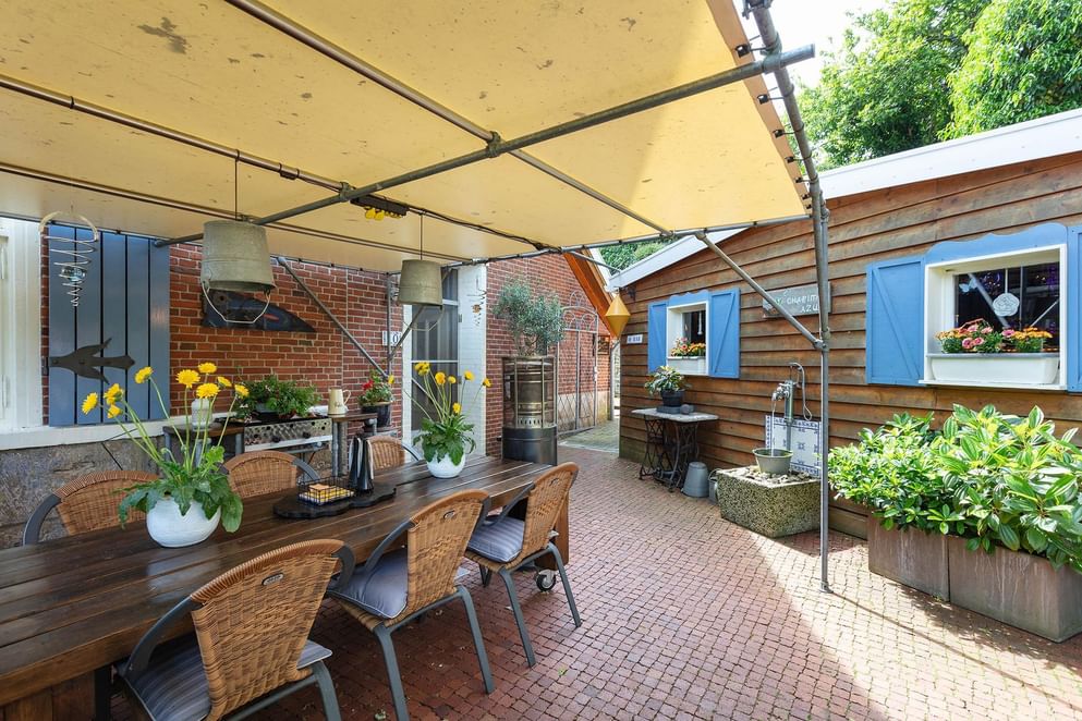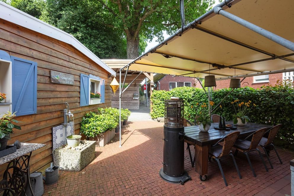 De tuin deels rondom is even sfeervol als de woning, aan de achterzijde zijn er fraaie geplante borders met tussendoor aangelegde paadjes met opstapjes. Tussen het groen zijn er meerdere zonneterrasjes, zit je liever beschut dan is aan de zijkant een overkapping gecreëerd waar het heerlijk vertoeven is. Tevens is aan de achterzijde een loungegedeelte onder de overkapping. Wordt het 's avonds kouder? Dan kun je plaats nemen in de gezellige "Kneipe" welke gerealiseerd is in de tuinchalet. De bar en aankleding doen niet onder voor een bruin café.