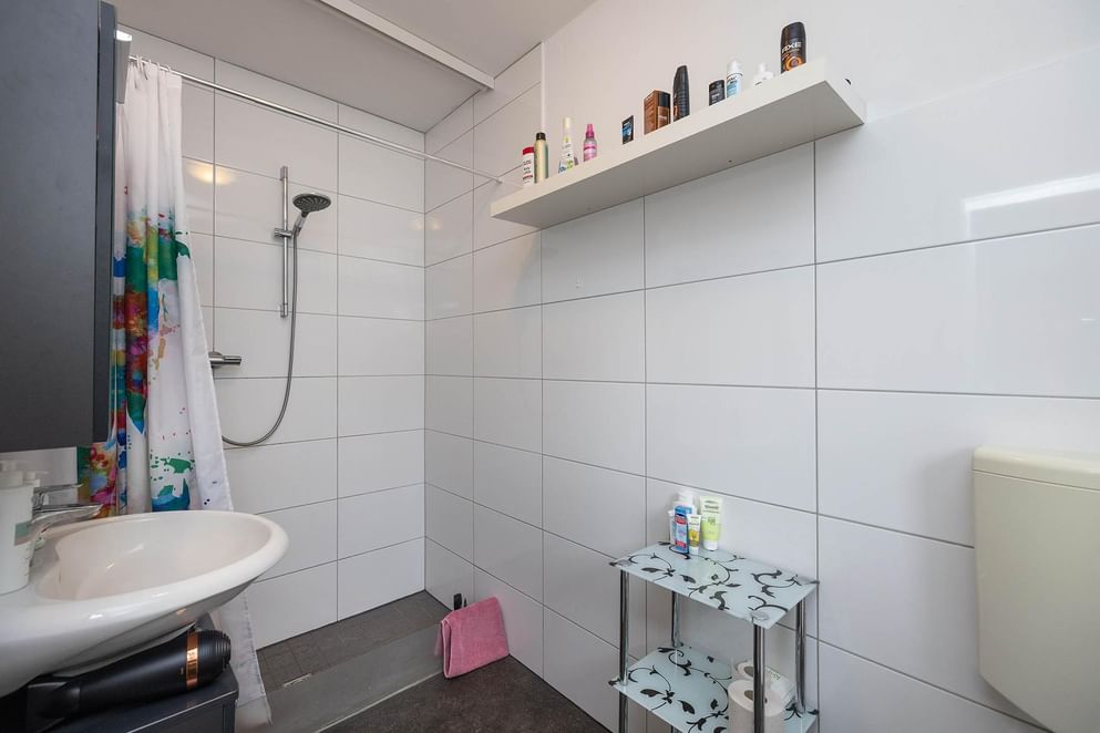 Op deze verdieping bevindt zich ook de netjes betegelde badkamer met douche, toilet en een wastafel met meubel.