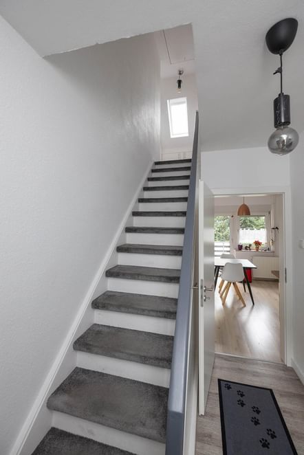 De vierkante meters aan woonoppervlak zijn verdeeld over meerdere verdiepingen, die allen een praktische indeling hebben. De speelsheid van de verdiepingen is met name aan de achterzijde van het woonhuis terug te zien, zo stap je vanuit de keuken op de begane grond via een loopdeur rechtstreeks het ruime en overdekte terras op. Dit hoogteverschil zit hem in het glooiende landschap van de omgeving Bad Bentheim, en deze hoogteverschillen heb je dan ook in de dorpen en steden zelf.