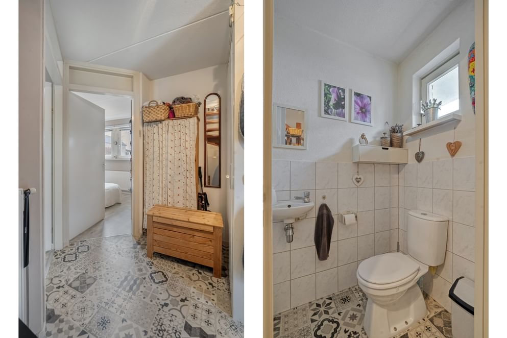 Via de entree kom je binnen in de hal met toiletruimte en trapopgang naar de eerste verdieping. Vanuit de hal zijn zowel de woonkamer als een ruime slaapkamer op de begane grond bereikbaar - ideaal voor gelijkvloers wonen. Deze slaapkamer beschikt over een en suite badkamer, voorzien van een wastafel, douche en wasmachineaansluiting.