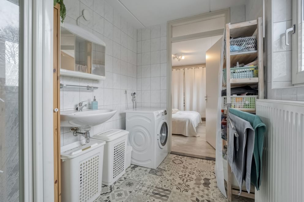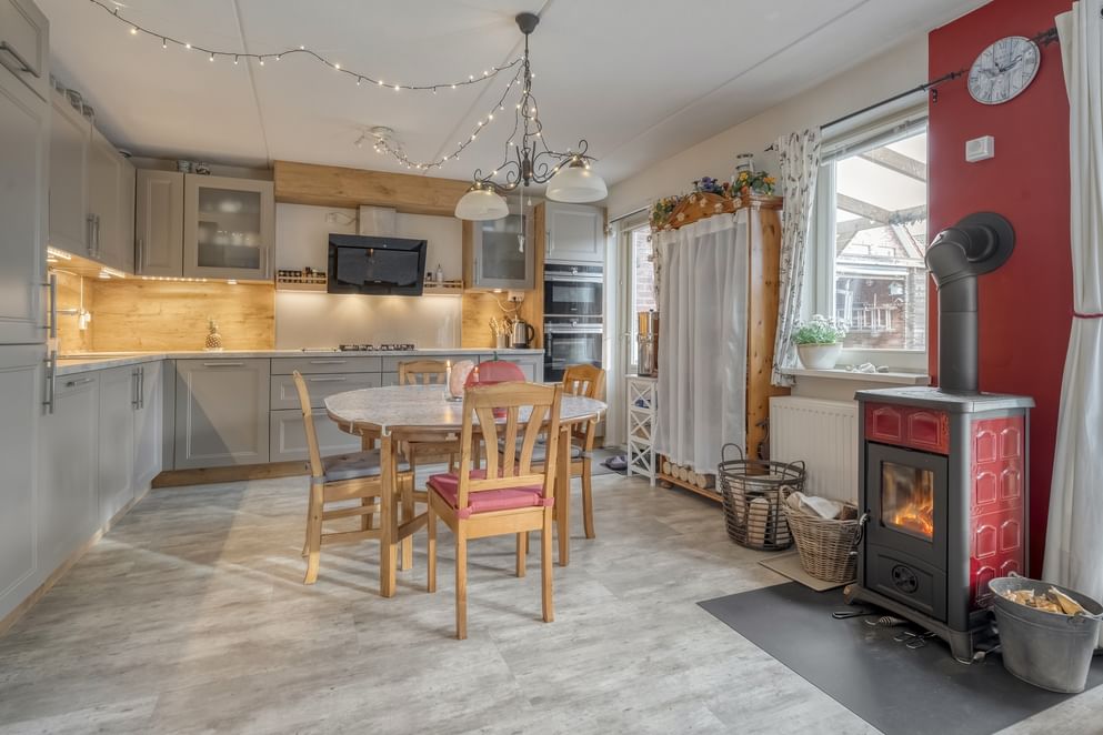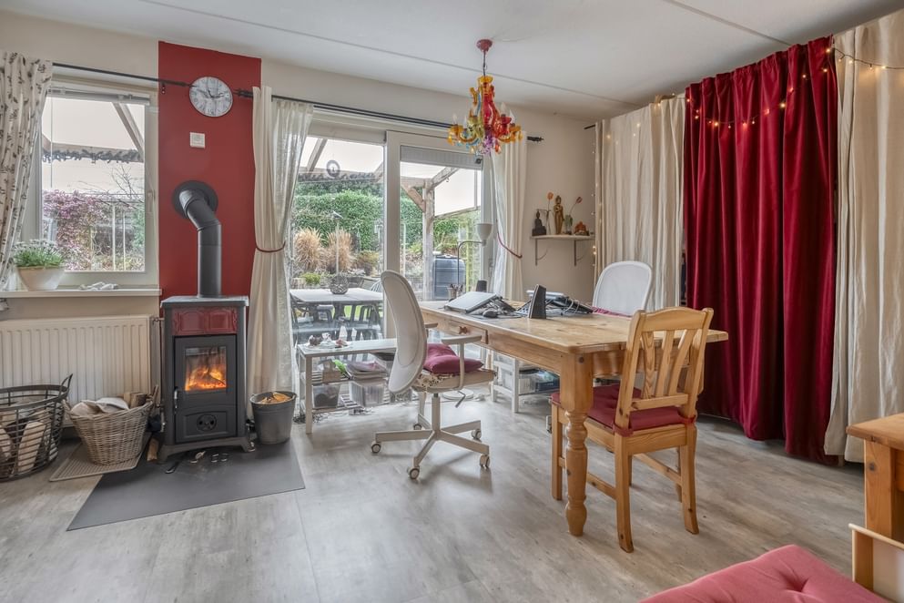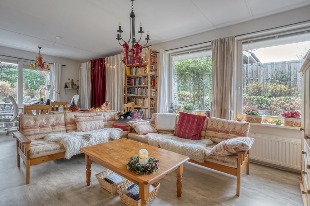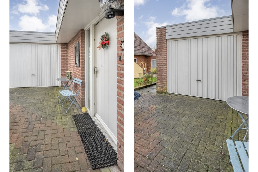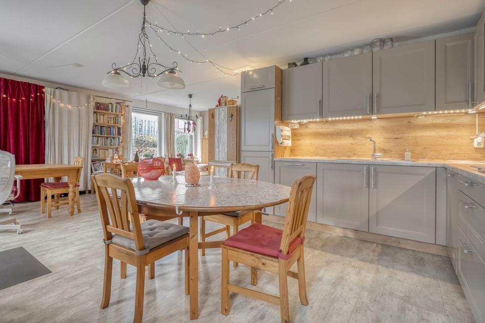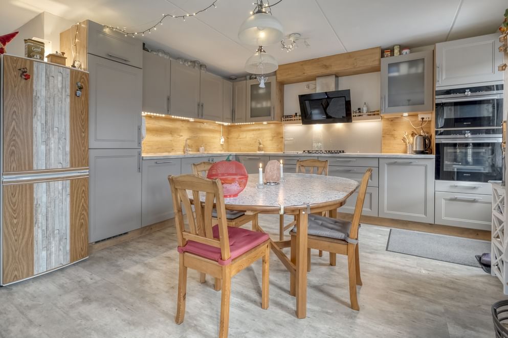 De woonkamer heeft een open en lichte indeling, met grote ramen die voor veel natuurlijk lichtinval zorgen. De ruimte loopt naadloos over in de open keuken, die in 2016 is vernieuwd en is voorzien van diverse inbouwapparatuur - een prettige plek om te koken en samen te zijn. Aan de achterzijde van de woning bevindt zich een ruime garage met elektra, ideaal voor opslag, hobby of het stallen van fietsen en auto.