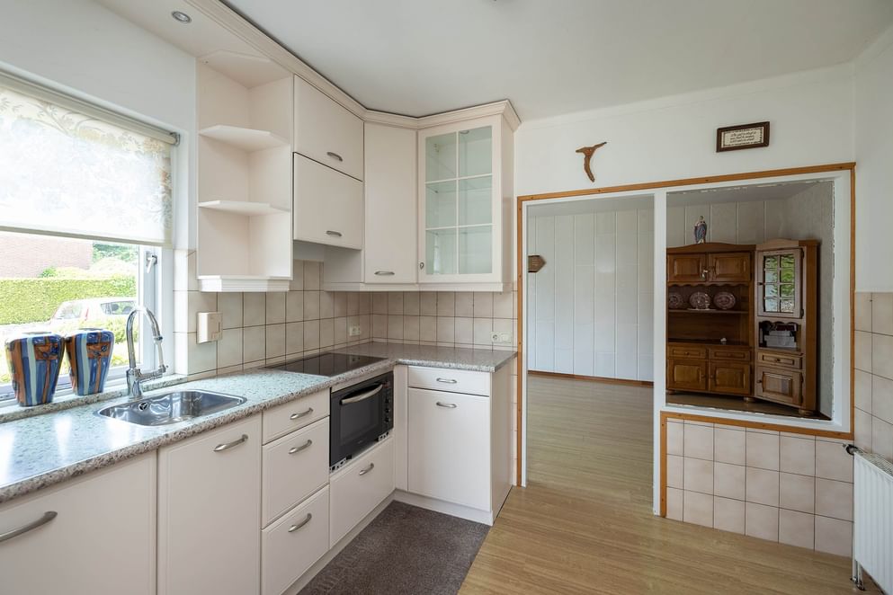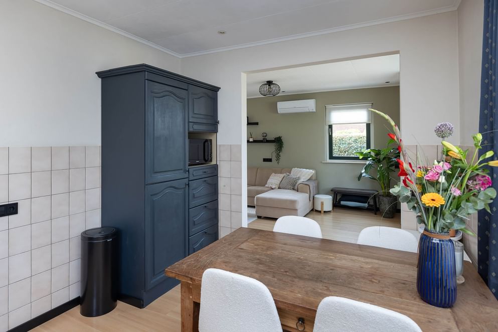 Via de entree aan de linkerzijde van de woning kom je binnen in de centrale hal. Vanuit hier zijn de toiletruimte, de trapopgang, een praktische provisiekelder én de open keuken bereikbaar. De keuken bevindt zich aan de voorzijde van de woning en is voorzien van onder andere een gasfornuis, koel-vriescombinatie en een spoelbak. Aansluitend loop je door naar de woonkamer, waar airconditioning zorgt voor een aangenaam klimaat.