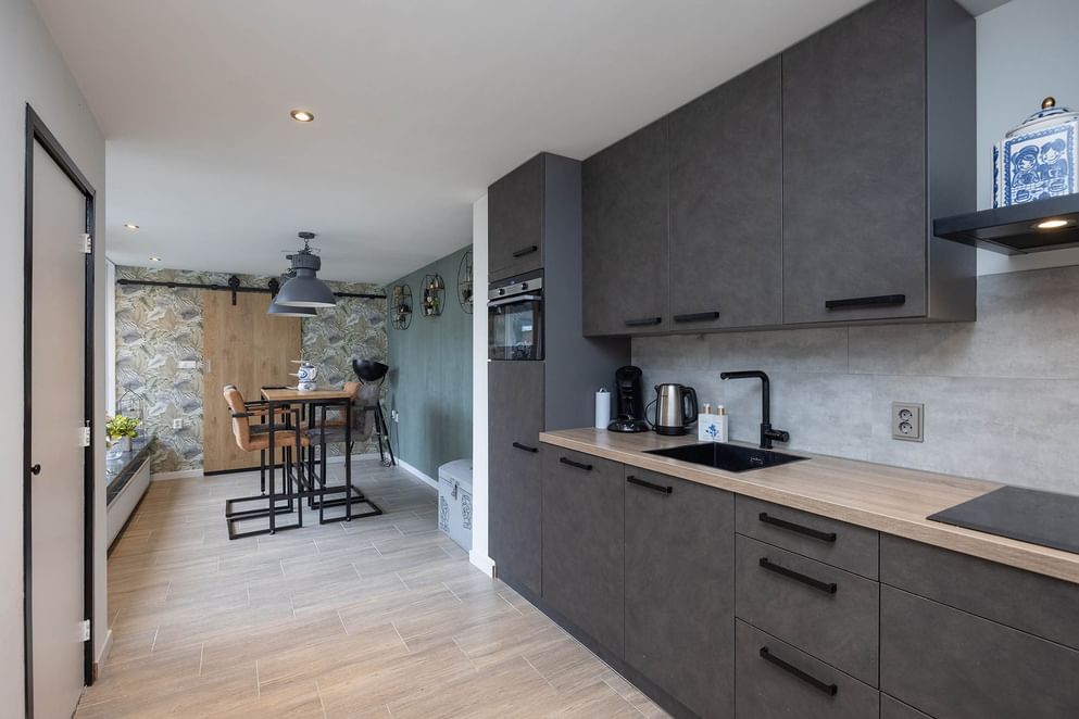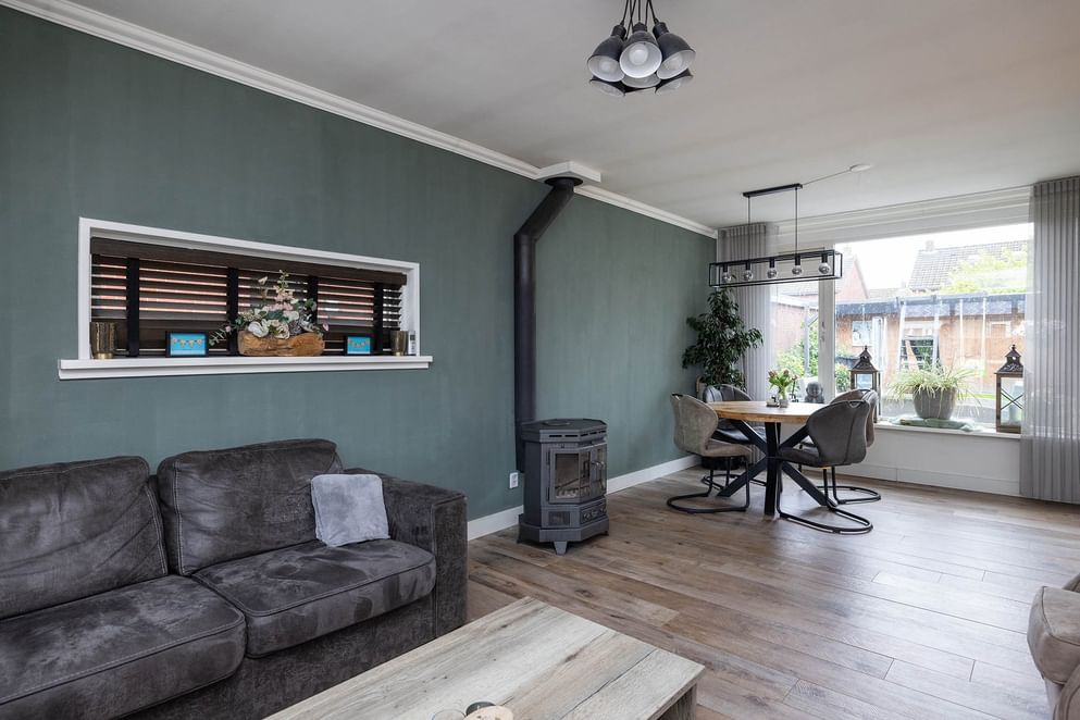 Je betreedt de woning via de entree die beschikt over een toiletruimte, meterkast, provisiekelder en trapopgang naar de eerste verdieping. De modern afgewerkte keuken is voorzien van diverse inbouwapparatuur, waaronder een inductiekookplaat, vaatwasser, koelkast en combi-oven. Vanuit de keuken heb je toegang tot de lichte, straatgerichte woonkamer voorzien van een erker, lichte plavuizen-vloer, sfeervolle houtkachel. De aangebouwde bijkeuken beschikt over een keukenblok, witgoedaansluiting en de toegangsdeur naar de goed onderhouden achtertuin.