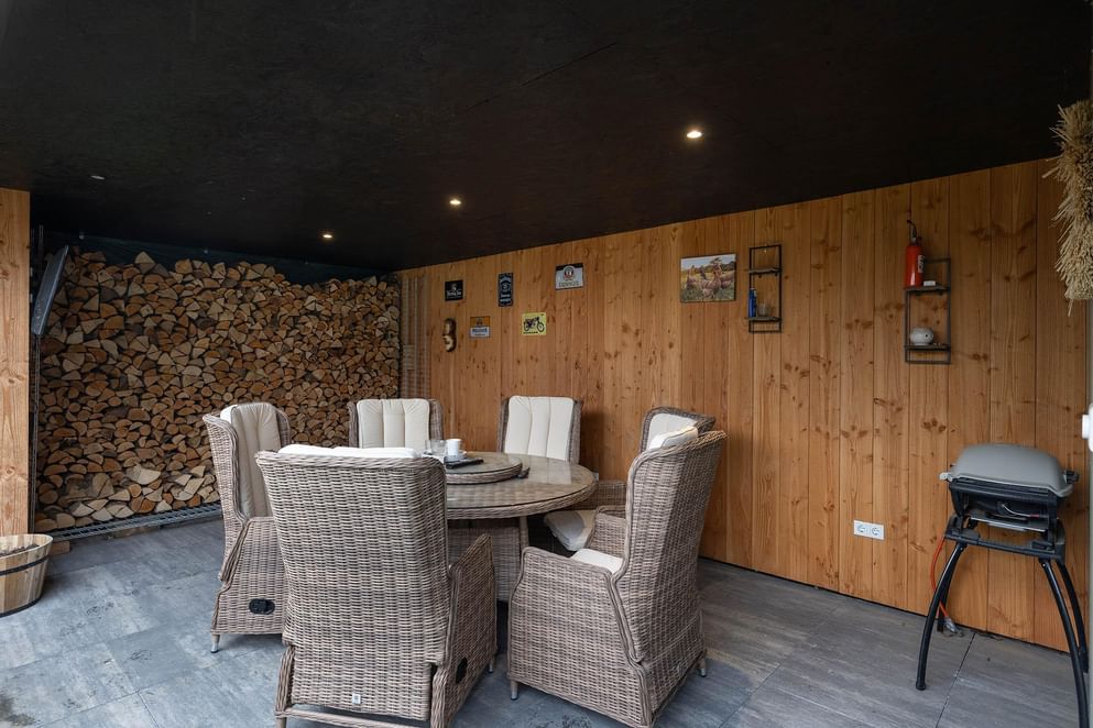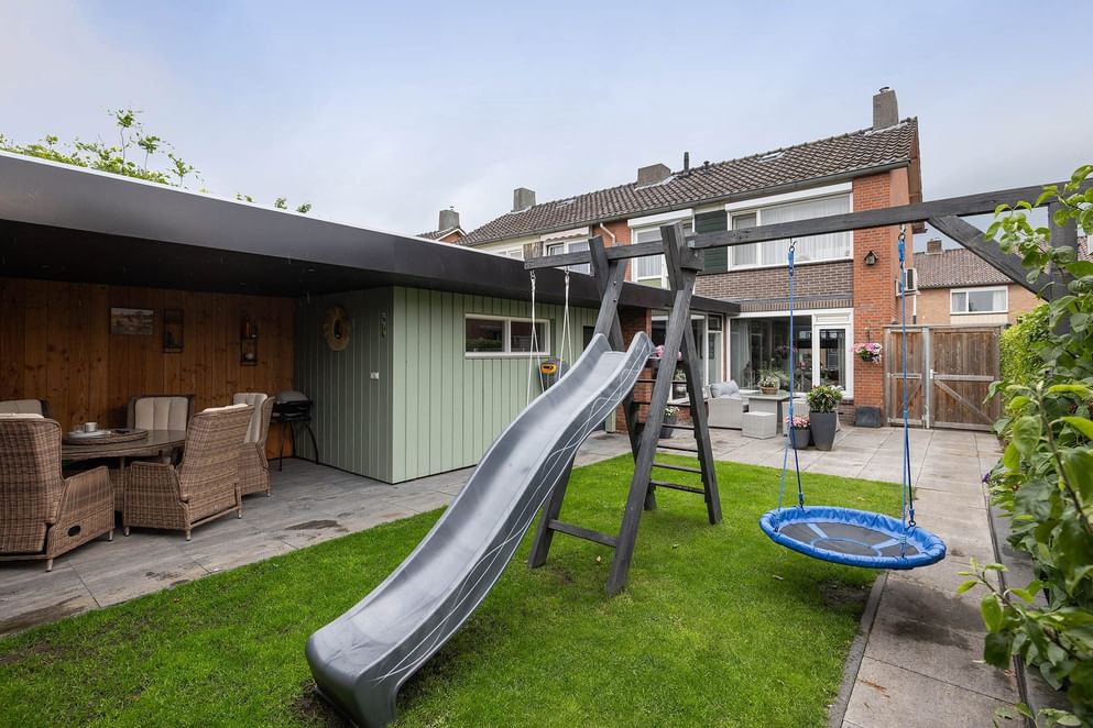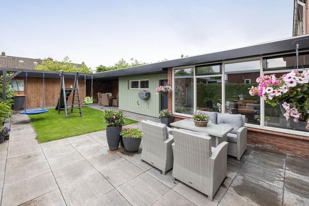 - Goed onderhouden achtertuin met overkapping en royale berging