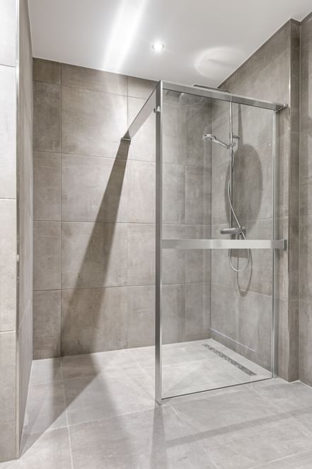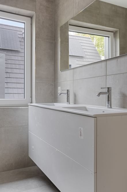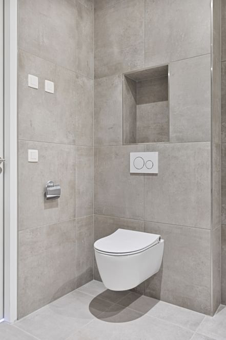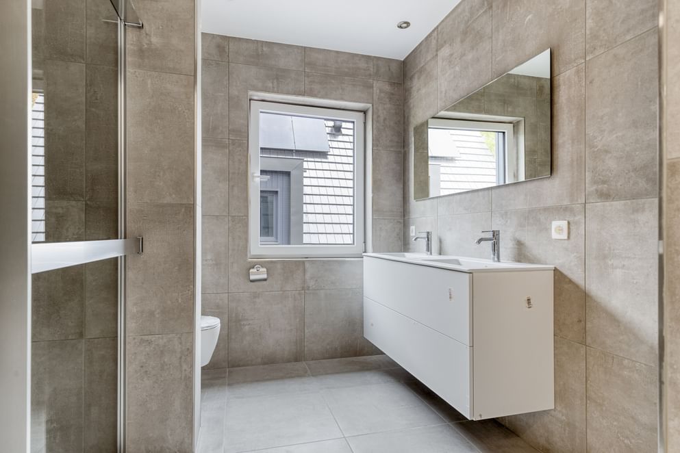 De badkamer is volledig betegeld en uitgerust met modern sanitair, een inloopdouche met glazen wand, een badkamermeubel en een toilet. Ook het separate toilet is volledig betegeld en hoogwaardig afgewerkt.
