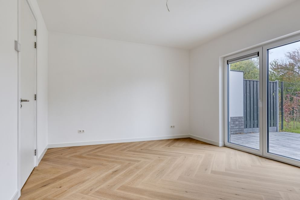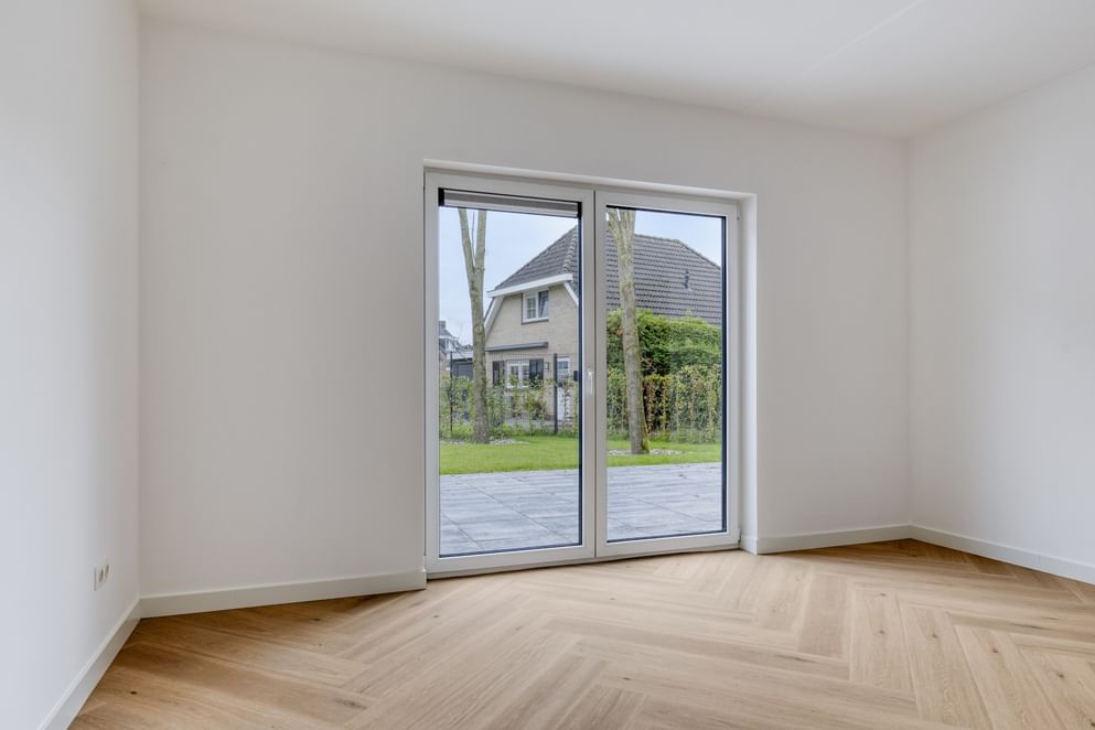 Entree met hal, meterkast, toiletruimte, trap naar de kelder en eerste verdieping. Vanuit de hal toegang tot de royale, tuingerichte woonkamer met veel lichtinval en toegang tot het terras. Aan de voorzijde bevindt zich de ruimte voor de keuken (nog te realiseren). De slaapkamer en badkamer op de begane grond maken de woning geschikt voor gelijkvloers wonen.