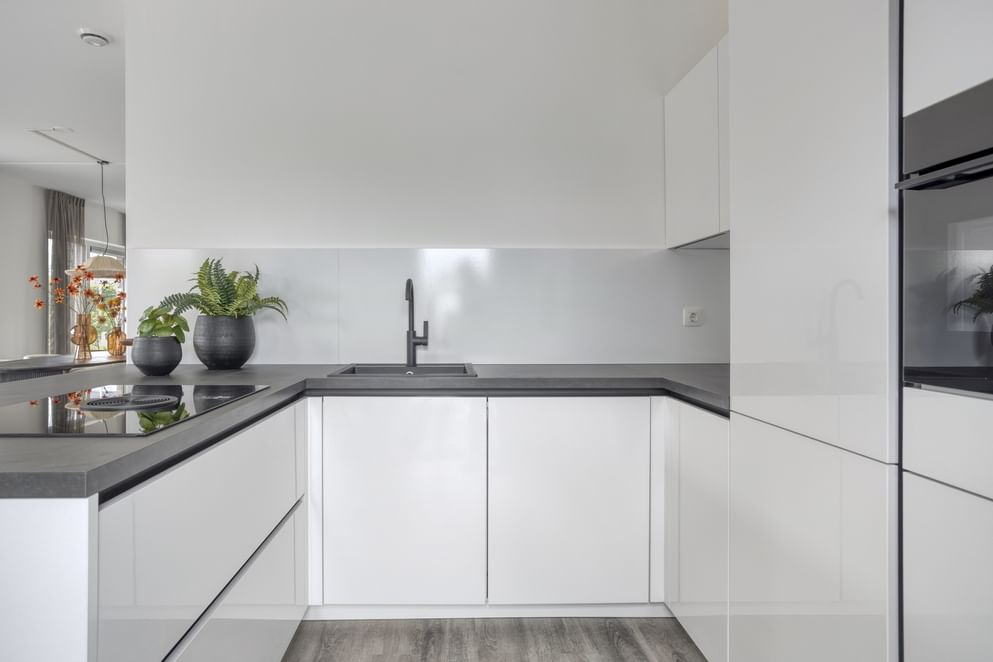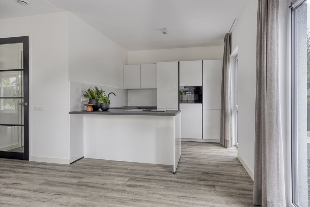 De keuken is nog niet geplaatst, zodat je deze geheel naar eigen wens kunt samenstellen. Indien gewenst kan de keuken worden uitgevoerd conform de modelwoning (zie afbeeldingen); plan gerust een bezichtiging in om inspiratie op te doen.