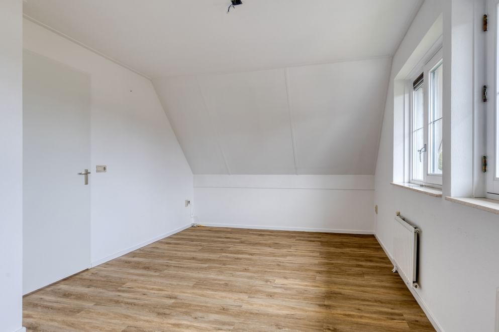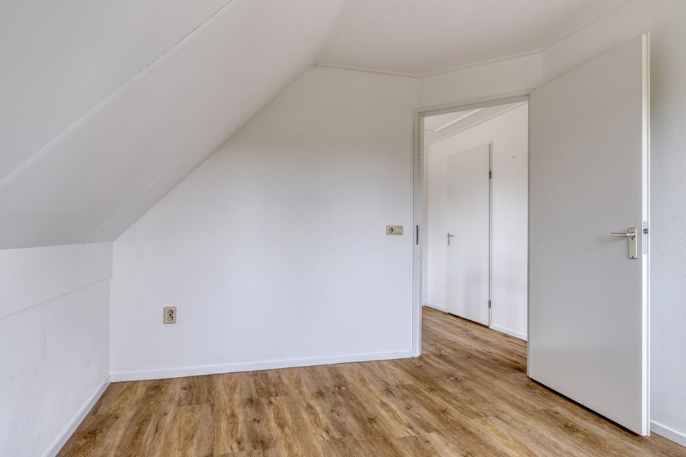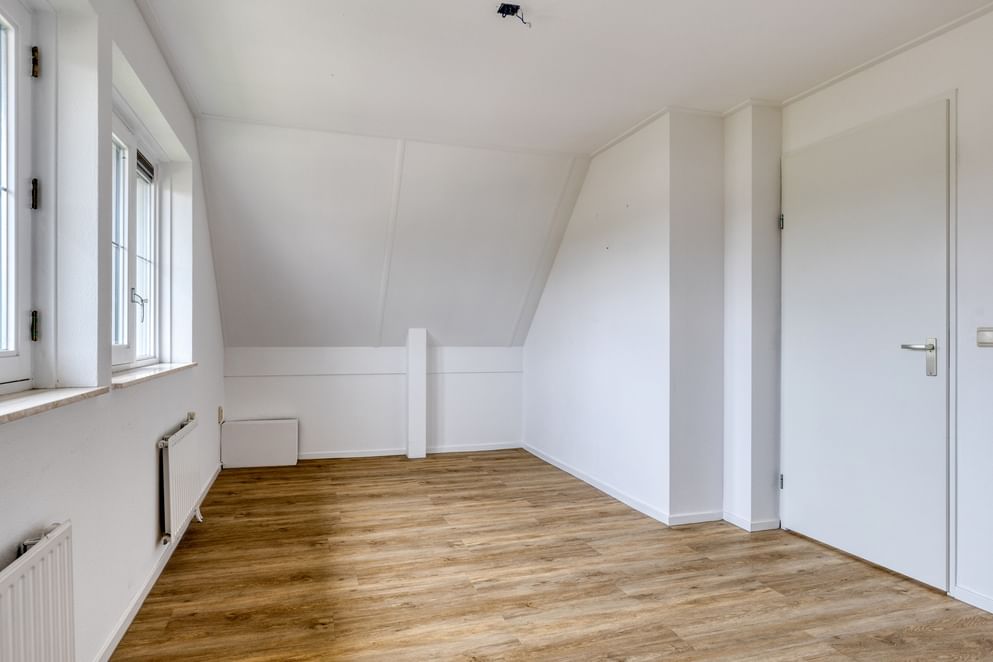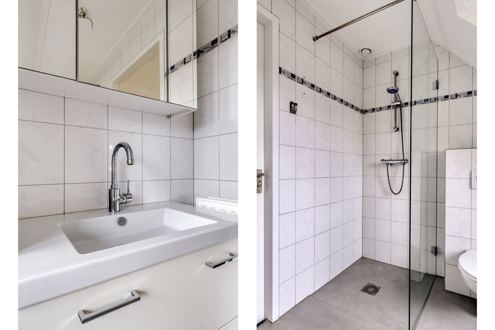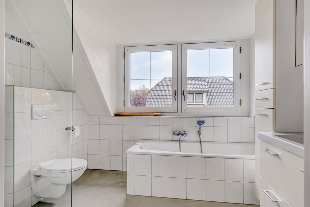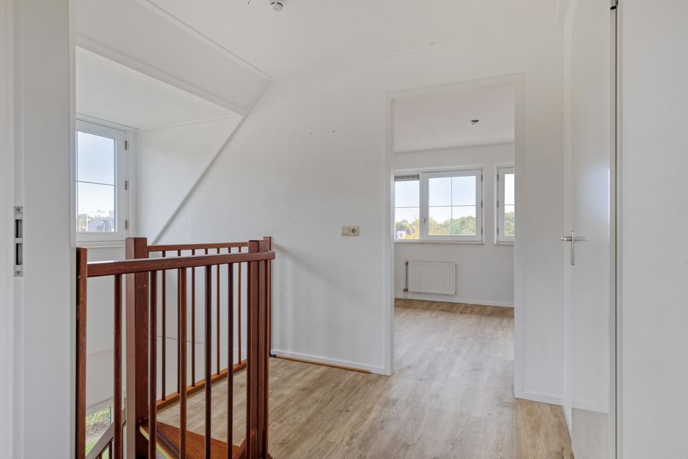 Overloop met veel lichtinval door de dakkapel, 3 slaapkamers. De volledig betegelde badkamer mét dakkapel is uitgerust met een ligbad, inloopdouche, dubbele wastafel met meubel en een toilet.