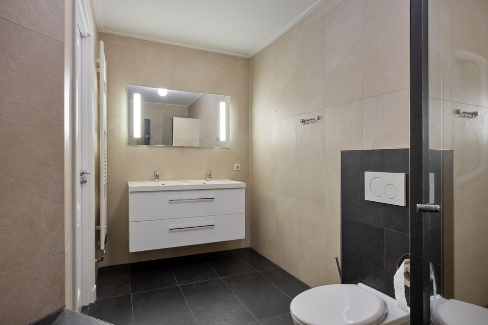 Via de overloop heb je toegang tot twee ruime slaapkamers, voorzien van vaste kasten en een toegangsdeur naar het balkon. De moderne badkamer is voorzien van een dubbele wastafelmeubel, inloopdouche, ligbad, toilet en designradiator. De extra bergkast op de overloop beschikt over de CV-opstelling en een witgoedaansluiting.
