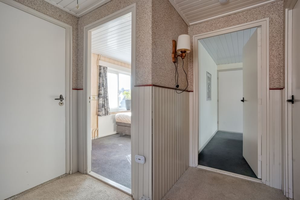 Via de vaste trap bereikt u de eerste verdieping. Vanaf de overloop heeft u toegang tot drie ruime slaapkamers, allen voorzien van een vaste kast. De slaapkamer aan de achterzijde beschikt bovendien over een balkon. De tweede badkamer is praktisch ingericht en voorzien van een wastafel en een inloopdouche.