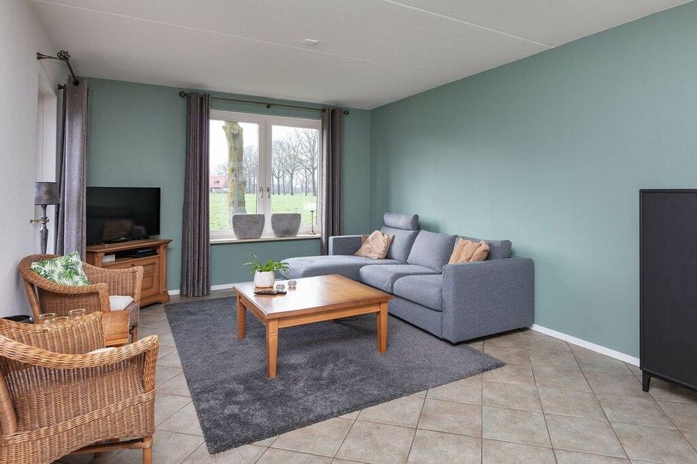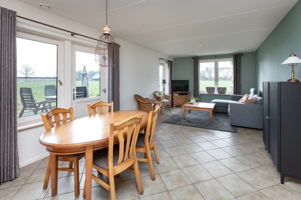 Je betreedt de woning middels de aan de voorzijde gelegen toegangsdeur naar de centrale hal. De hal is voorzien van een vaste kastenwand, verhoogde opstelplaats voor de wasmachine en droger en een toiletruimte met wandcloset en fonteintje. De woonkamer, voorzien van een plavuizenvloer met vloerverwarming, is gelegen aan de achterzijde. In deze ruimte bevindt zich ook de open keuken met nette inbouwkeuken, in beuken kleurstelling, voorzien van keramische kookplaat, oven, vaatwasser en koelkast. Vanuit de eethoek biedt een loopdeur toegang tot het terras met een grandioos ver gezicht over het Twentse landschap. Tevens bevinden zich op de begane grond ook de ruime slaapkamer en de eigentijdse badkamer welke is uitgerust met een ligbad, douchehoek, wastafel en wandcloset.