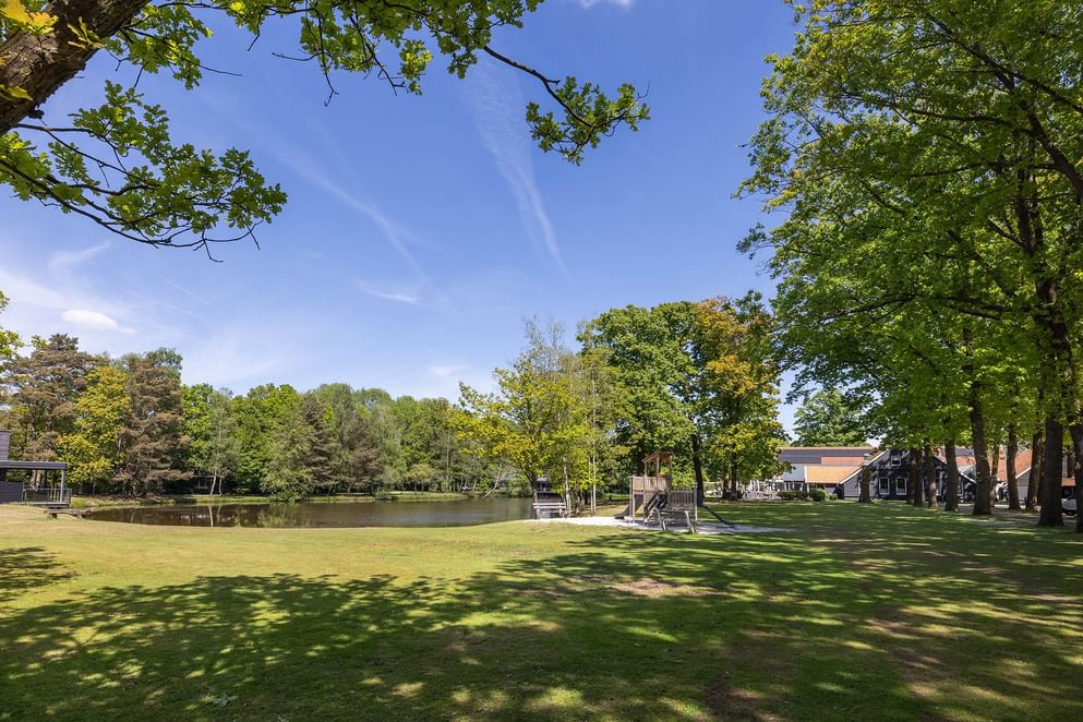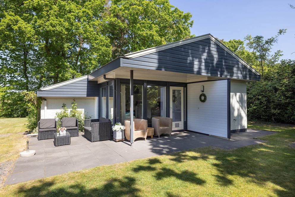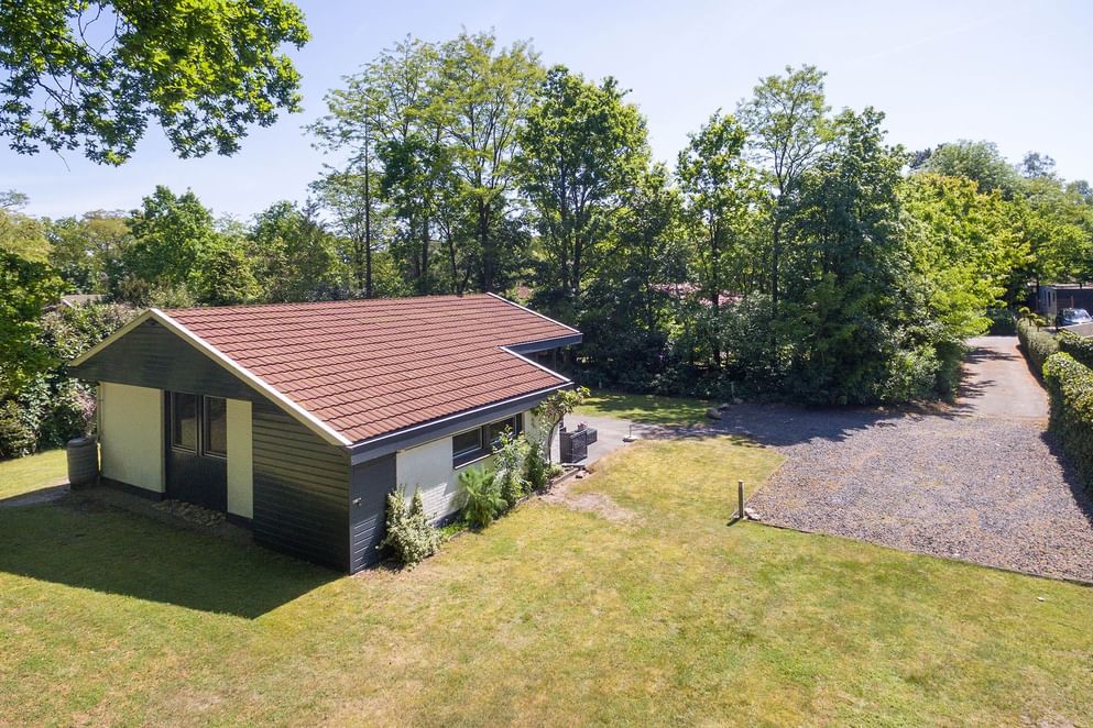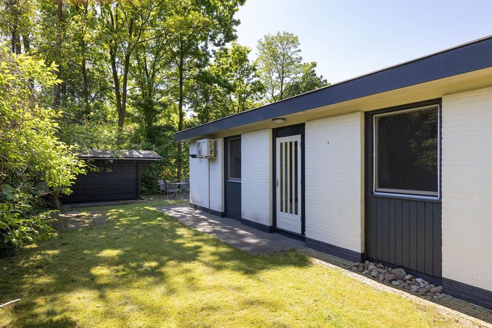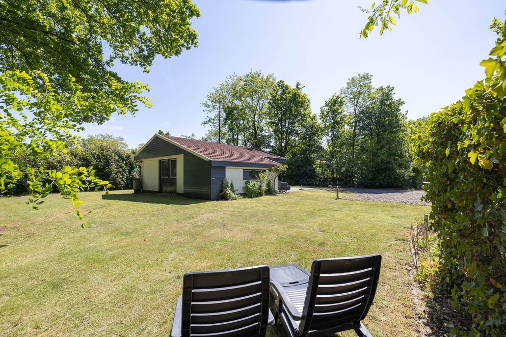 Via een kiezellooppad bereik je het ruime, betegelde terras aan de voorzijde die deels overdekt is. De tuin ligt rondom de bungalow en biedt volop privacy dankzij de groene begroeiing en de brede boompartij. De open indeling creëert volop ruimte voor ontspanning én een speelplek voor de kinderen.