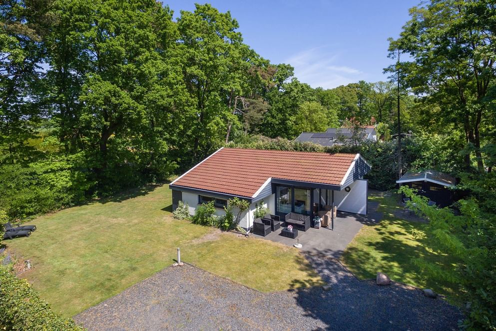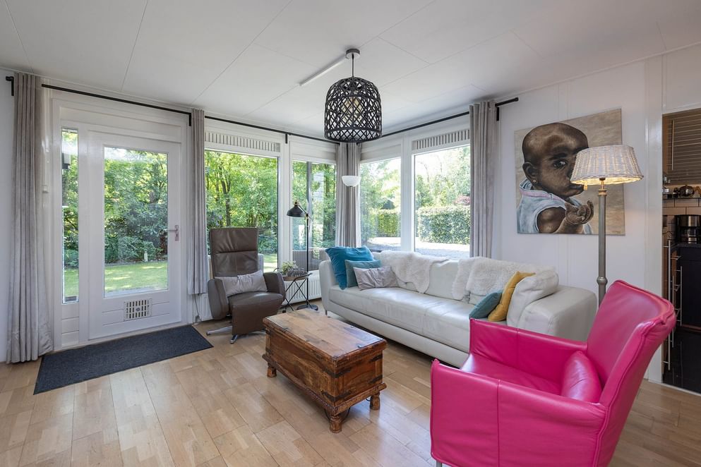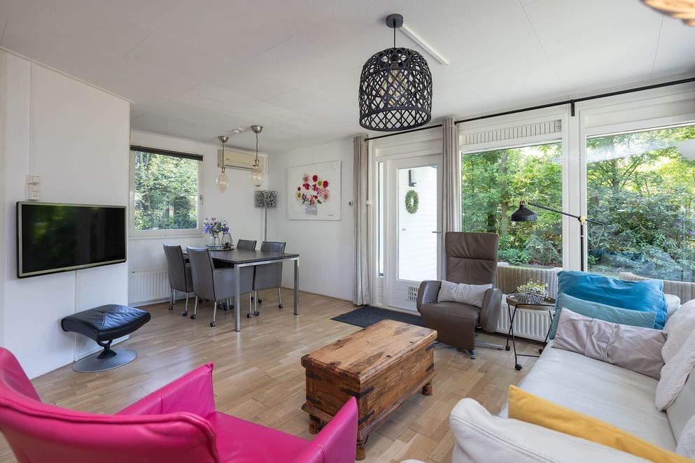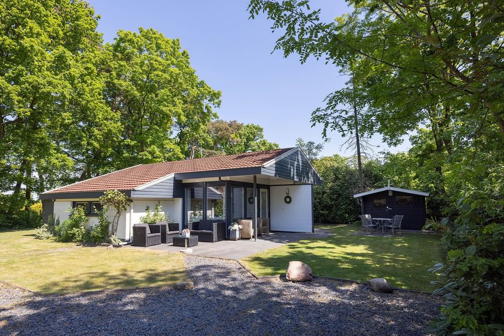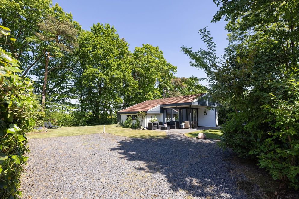 Via een kiezellooppad bereik je het ruime, betegelde terras aan de voorzijde die deels overdekt is. De tuin ligt rondom de bungalow en biedt volop privacy dankzij de groene begroeiing en de brede boompartij. De open indeling creëert volop ruimte voor ontspanning én een speelplek voor de kinderen.