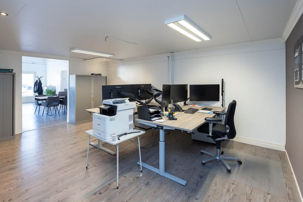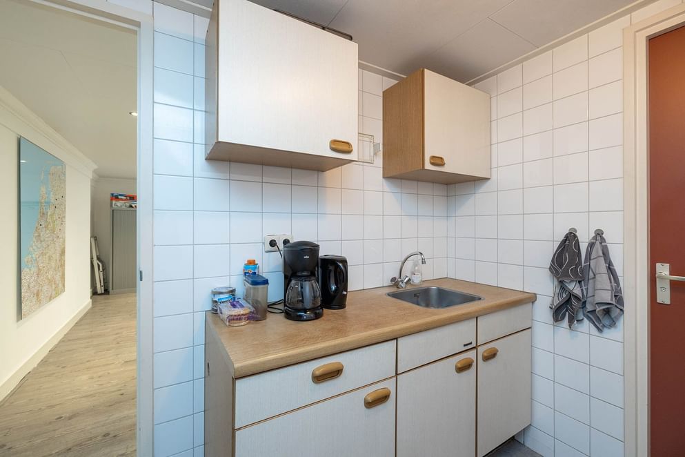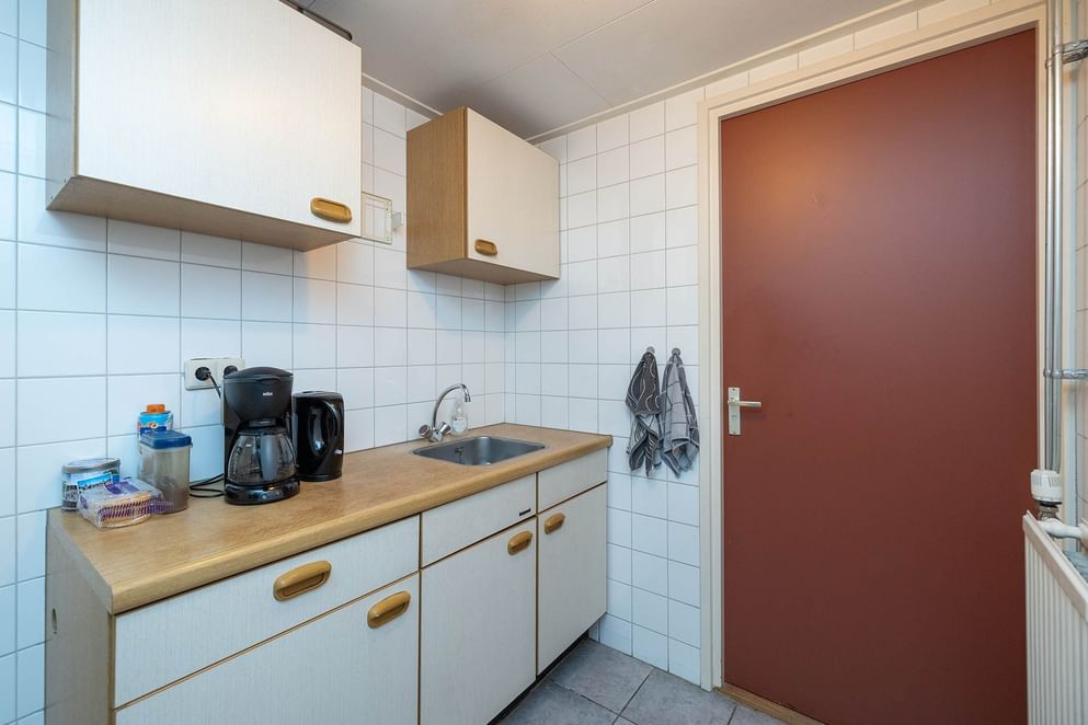 Winkel-/kantoorruimte I, winkel-/kantoorruimte II, pantry v.v. keukenblok met wasbak, toiletruimte v.v. toilet en fontein.
