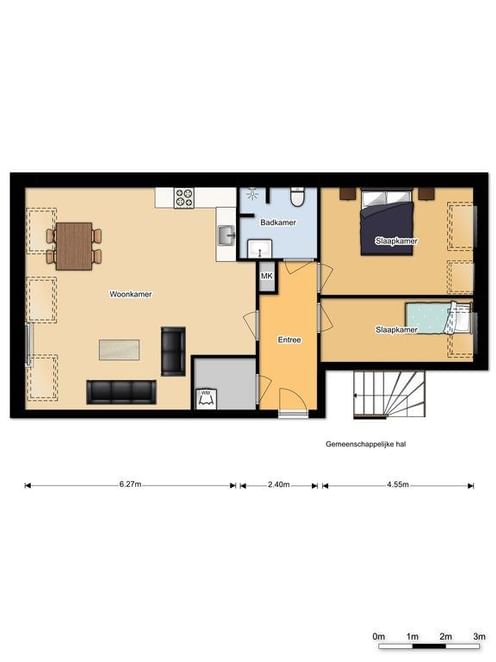 In het centrum op de 1e verdieping gelegen sfeervol en modern afgewerkt 3-kamer appartement. Het appartement is bereikbaar via de centrale hal met trapopgang. In de centrale hal is ook de inpandige berging behorende bij het appartement gesitueerd.