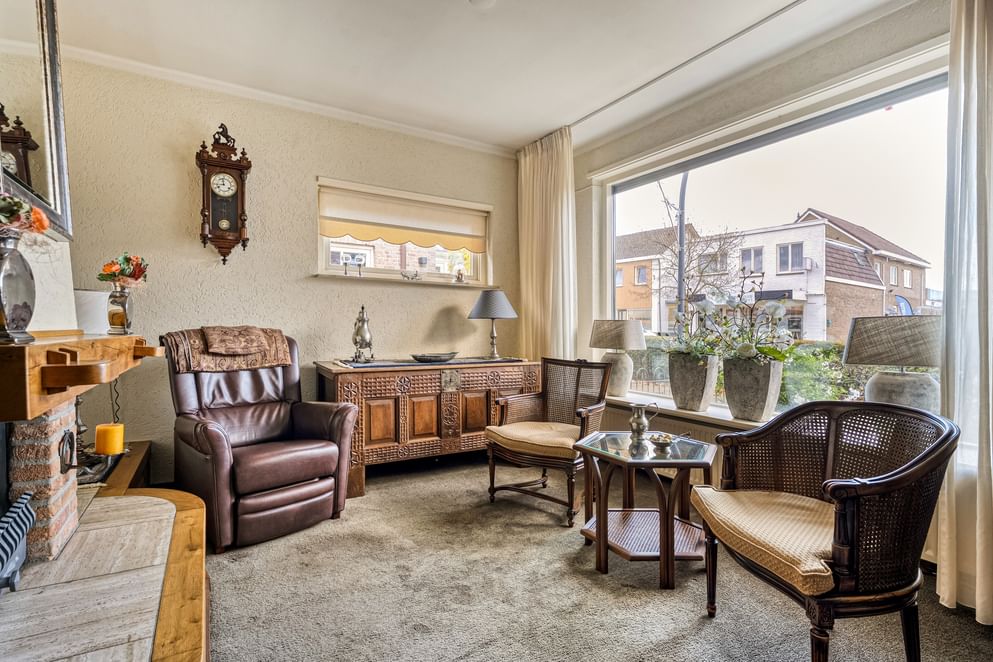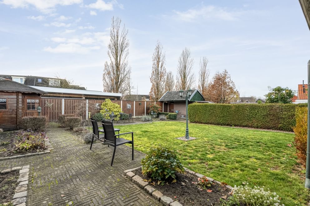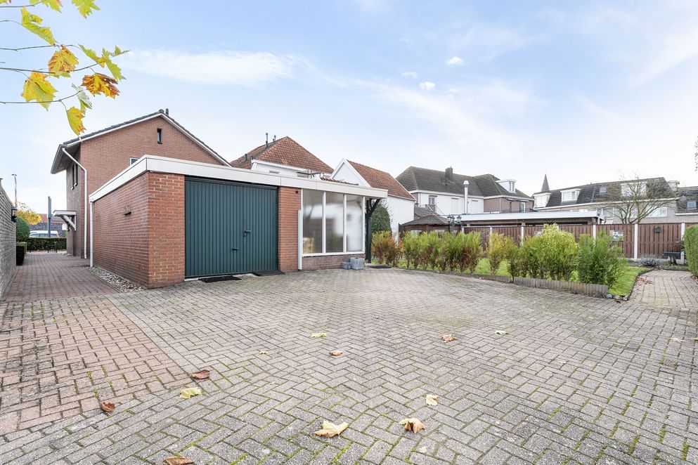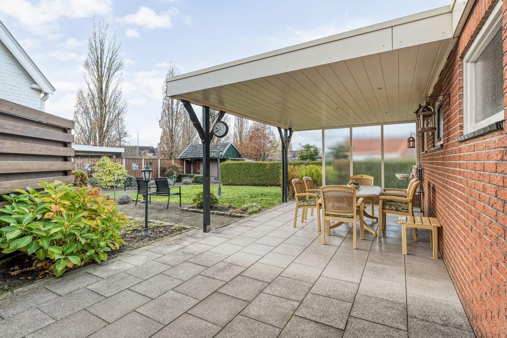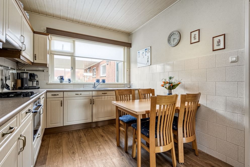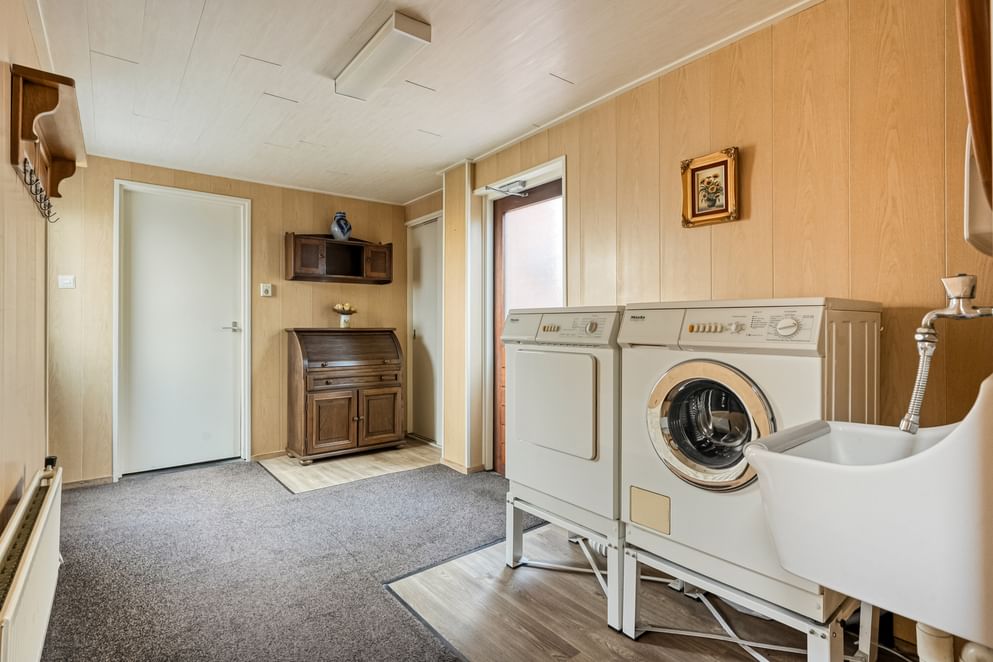 Via de zijkant van de woning bereik je de entree, die toegang biedt tot de ruime hal met trapopgang naar de eerste verdieping, provisiekelder, het toilet en de woonkamer. De L-vormige woonkamer, gelegen aan de voorzijde van de woning, is voorzien van een sfeervolle gashaard. Vanuit de woonkamer loop je door naar de aangebouwde keuken, die van alle gemakken is voorzien en beschikt over een lichtkoepel wat zorgt voor veel natuurlijk lichtinval. Vanuit de keuken is de praktische bijkeuken bereikbaar, ideaal voor het plaatsen van de wasmachine en droger. Vanuit de bijkeuken heb je toegang tot zowel de ruime garage als de diepe, groene tuin. De tuin biedt volop mogelijkheden en is verzorgd aangelegd. Een overkapping aan de garage maakt overdekt zitten mogelijk terwijl de rest van de tuin vrij is in te richten met diverse zitplekken en groen. Verder beschikt de tuin over twee handige schuurtjes, één van hout en één van steen, voor extra opslagruimte. Langs de gehele woning loopt een stenen pad, dat toegang geeft tot zowel de woning als de garage.