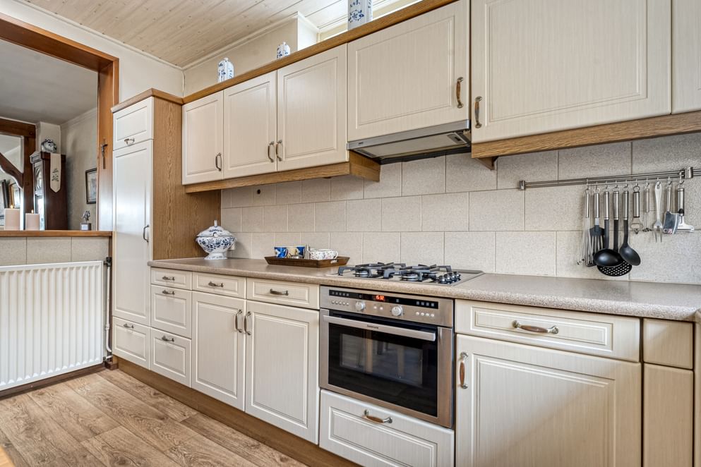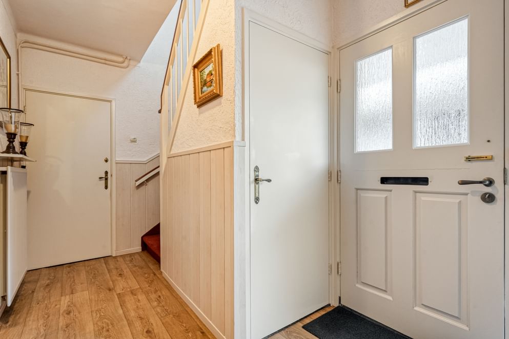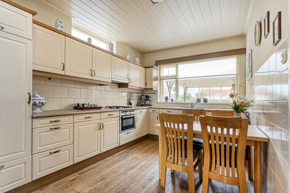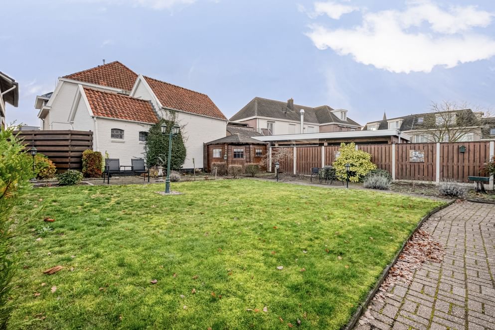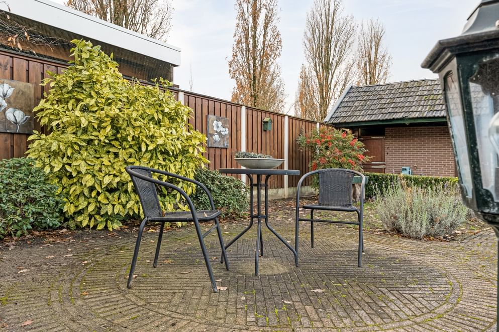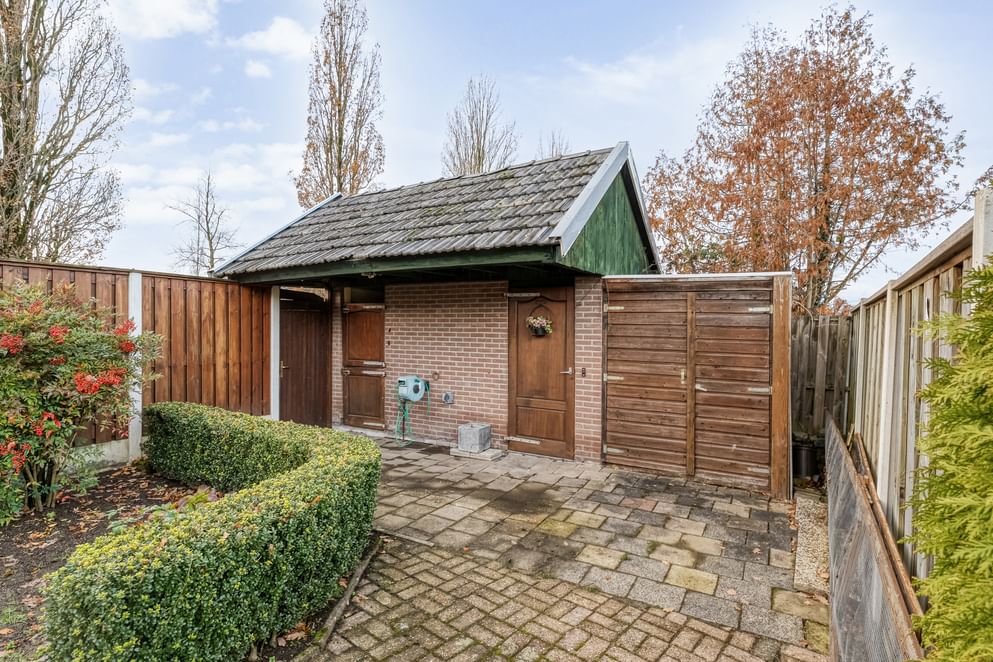 Via de zijkant van de woning bereik je de entree, die toegang biedt tot de ruime hal met trapopgang naar de eerste verdieping, provisiekelder, het toilet en de woonkamer. De L-vormige woonkamer, gelegen aan de voorzijde van de woning, is voorzien van een sfeervolle gashaard. Vanuit de woonkamer loop je door naar de aangebouwde keuken, die van alle gemakken is voorzien en beschikt over een lichtkoepel wat zorgt voor veel natuurlijk lichtinval. Vanuit de keuken is de praktische bijkeuken bereikbaar, ideaal voor het plaatsen van de wasmachine en droger. Vanuit de bijkeuken heb je toegang tot zowel de ruime garage als de diepe, groene tuin. De tuin biedt volop mogelijkheden en is verzorgd aangelegd. Een overkapping aan de garage maakt overdekt zitten mogelijk terwijl de rest van de tuin vrij is in te richten met diverse zitplekken en groen. Verder beschikt de tuin over twee handige schuurtjes, één van hout en één van steen, voor extra opslagruimte. Langs de gehele woning loopt een stenen pad, dat toegang geeft tot zowel de woning als de garage.