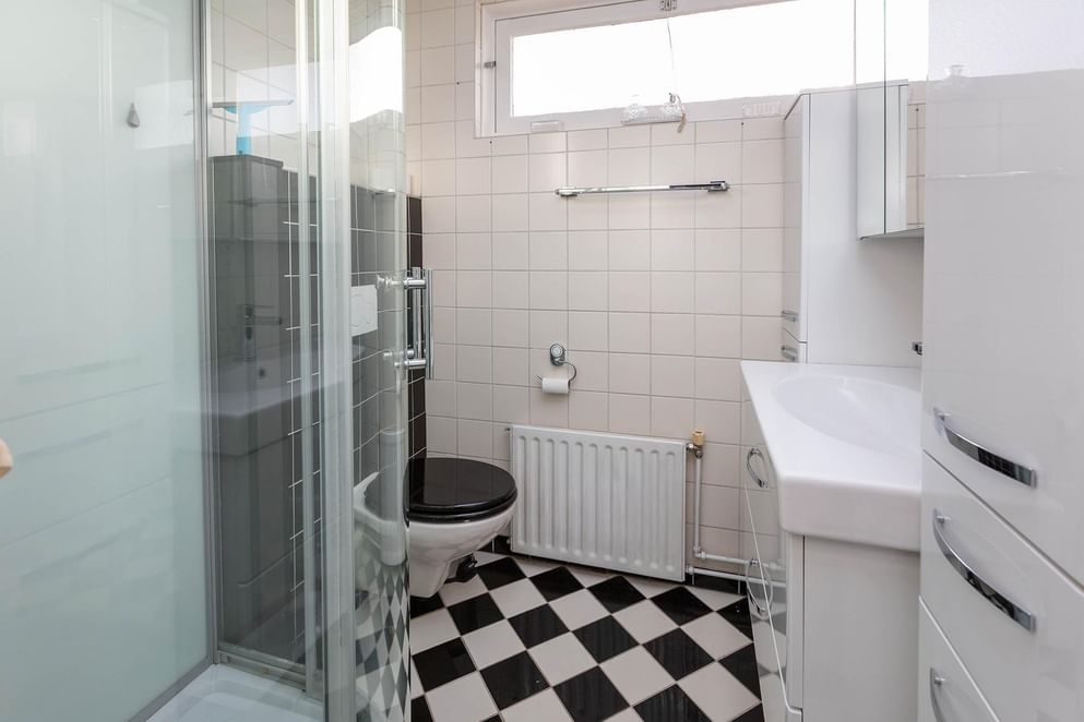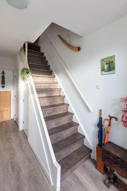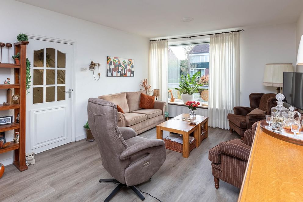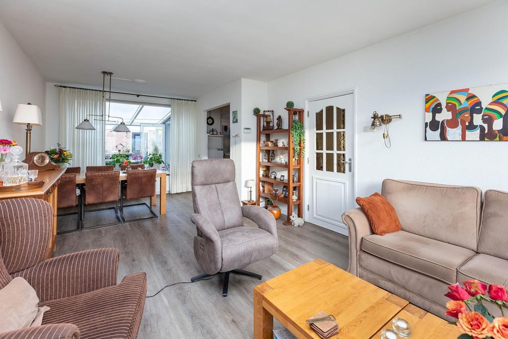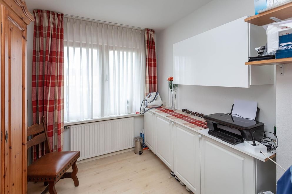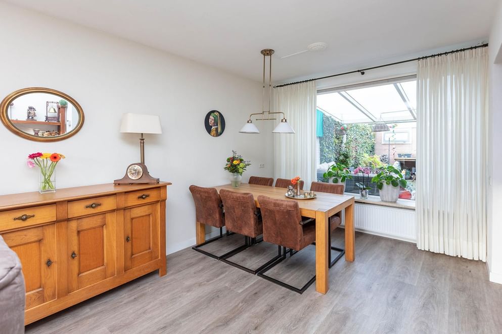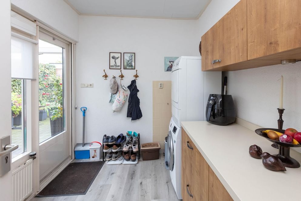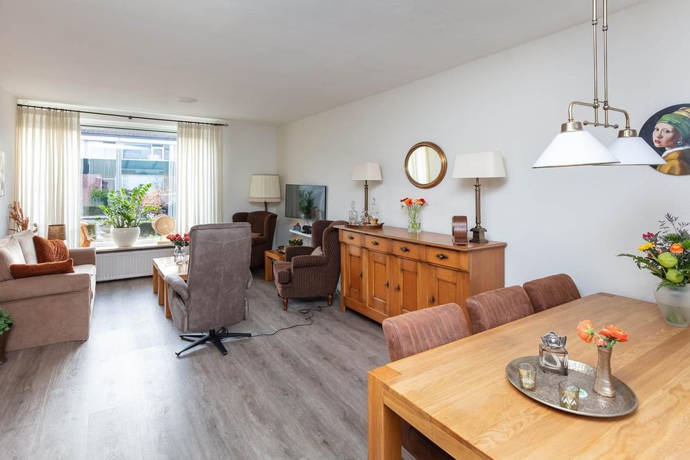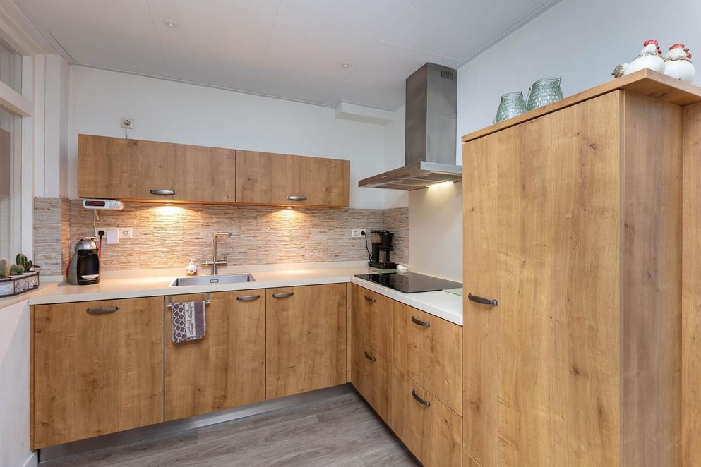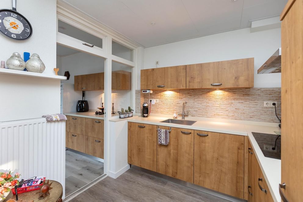Je betreedt de woning middels de hal met gerenoveerde trapopgang, vernieuwde meterkast, trapkast en toiletruimte met vrijdragend toilet. De houtlook PVC vloer (2022) is doorgetrokken in zowel de keuken als de woonkamer. Deze laatste is straatgericht en beschikt aan de voorzijde over een screen. De woonkamer biedt verrassend veel ruimte voor zowel een zitgedeelte als een 6-persoons eettafel. De open keuken beschikt over een inbouwkeuken (2017) welke met zijn in eiken kleurstelling fronten en licht composieten werkblad zeker een eyecatcher is. Voorzien van gemakken als een inductie kookplaat, afzuigkap, koelkast en een vaatwasser is hier in een handomdraai een heerlijke maaltijd te bereiden. Het keukenblok is doorgetrokken in de bijkeuken met de wasmachine-/drogeropstelling, wasbak en een loopdeur naar de achtertuin.