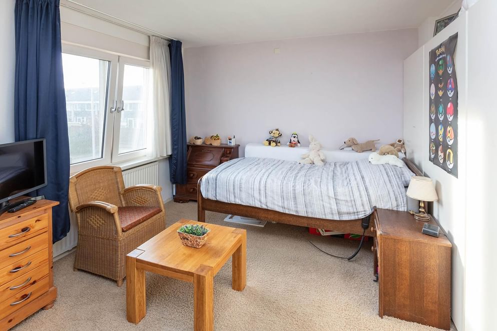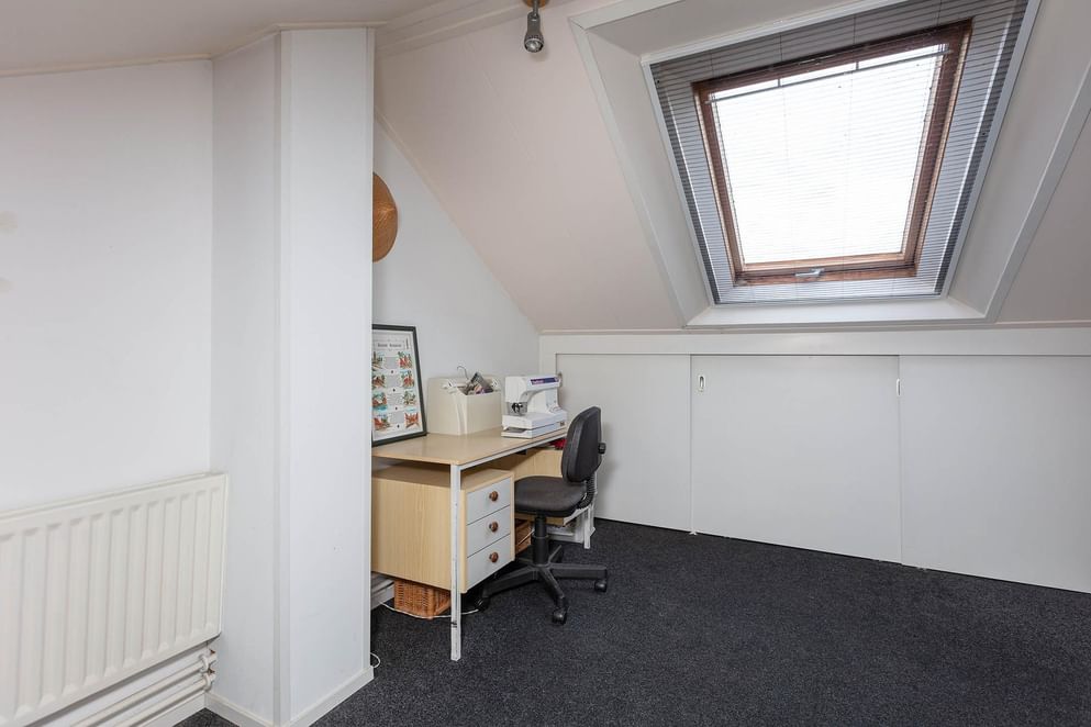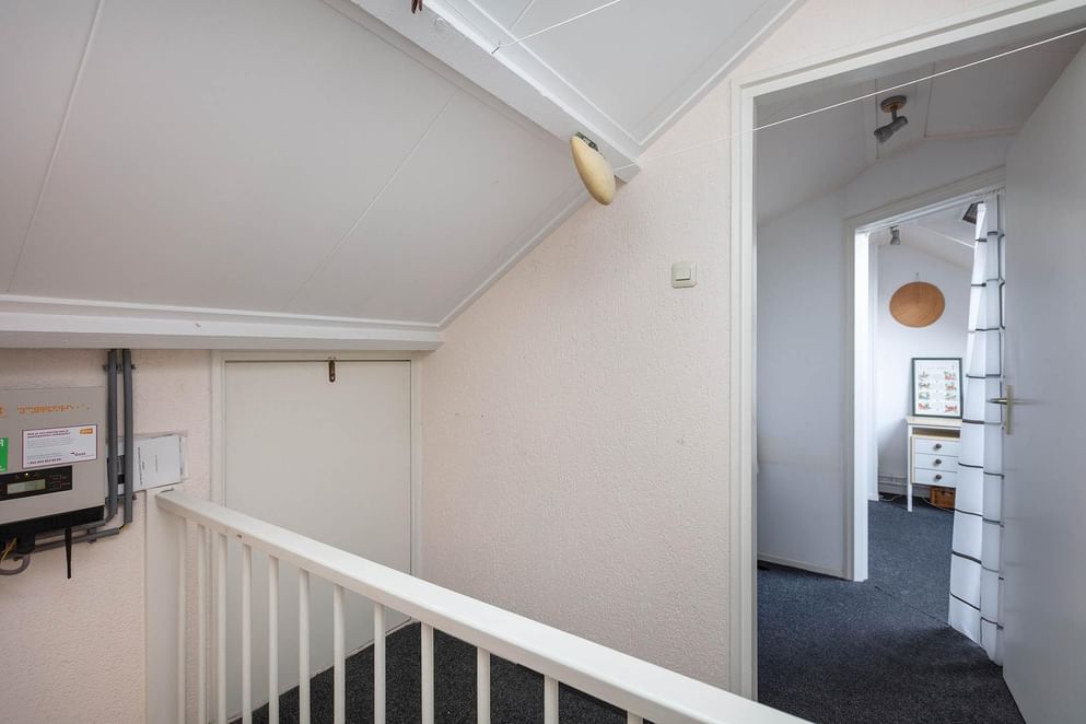 Door middel van een vaste trap te bereiken overloop voorzien van de omvormer voor de zonnepanelen. De C.V. is aangesloten in een ruimte welke tevens nog voldoende mogelijkheid biedt voor het bergen van jouw spullen. Via een tussenportaal is een slaap-/hobbykamer met dakvenster en knieschotten te bereiken.