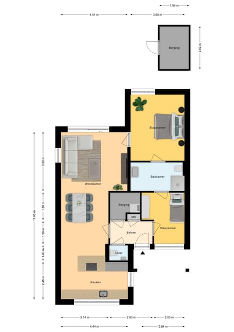 Bij binnenkomst stap je in een ruime hal die toegang biedt tot de wasruimte, het toilet, een slaap- of hobbykamer en de leefruimte met open keuken. De toiletruimte is voorzien van een fonteintje en een wc. Geen extra slaapkamer nodig? Geen probleem! Deze kamer kun je volledig naar eigen wens inrichten. Of je nu kiest voor een thuiskantoor, hobbyruimte of iets anders: de mogelijkheden zijn eindeloos. In het woongedeelte vind je de open keuken en de aangrenzende woonkamer. Dankzij de grote raampartijen genieten beide ruimtes van veel natuurlijk licht. De woonkamer is voorzien van een open nok, die niet alleen een ruimtelijk gevoel creëert, maar ook toegang biedt tot de zolder. Vanuit de woonkamer bereik je de master bedroom. Deze royale slaapkamer heeft een directe doorgang naar de badkamer, die is uitgerust met een douche, toilet en wastafel.