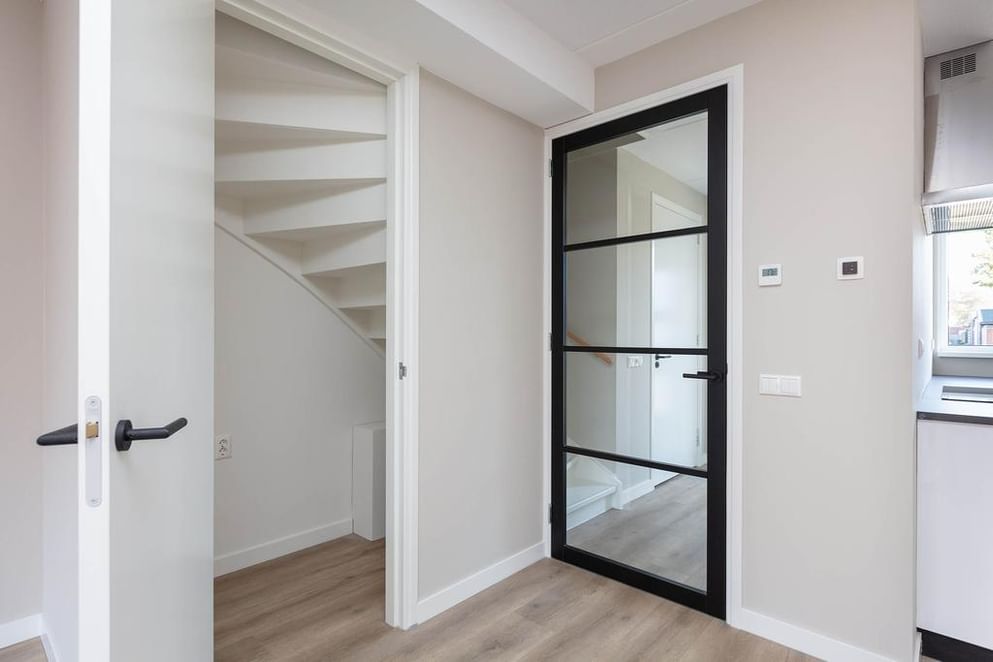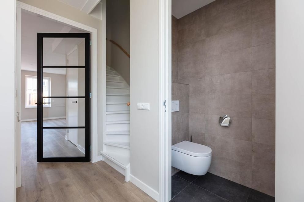Je komt binnen via de entree met meterkast en toiletruimte (voorzien van een hangend closet en fontein). De ruime woonkamer aan de tuinzijde is heerlijk licht dankzij de grote raampartijen en openslaande tuindeuren. Door de ligging op het westen geniet je hier volop van de middag- en avondzon. Een praktische trapkast biedt extra bergruimte.