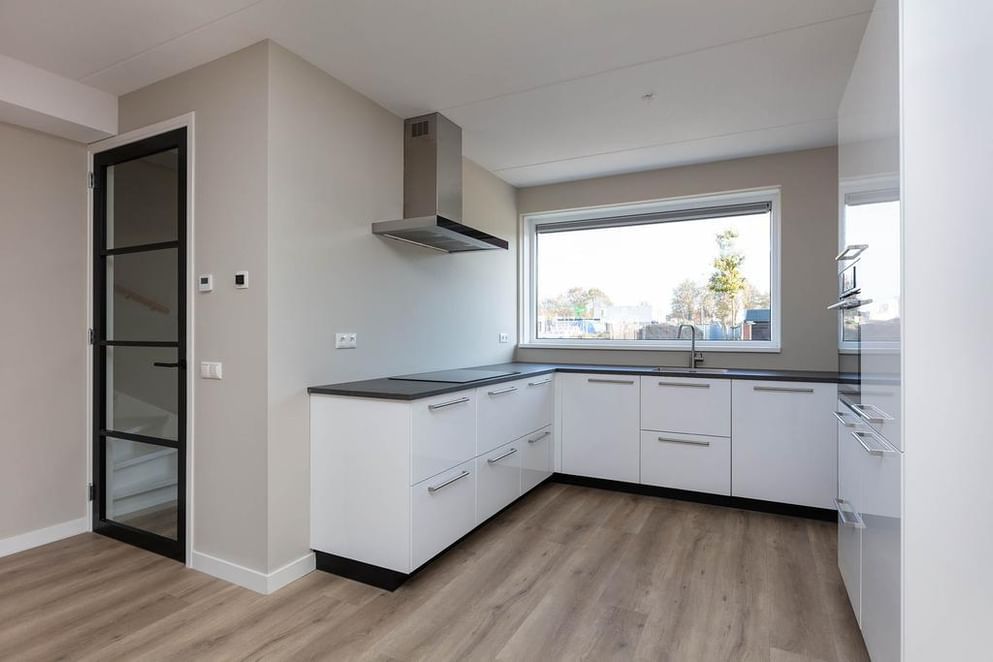 De keuken is aan de voorzijde van de woning gesitueerd en heeft een eigentijdse uitstraling. Dankzij de moderne opstelling en goede afwerking is deze keuken een fijne plek om te koken en samen te komen.