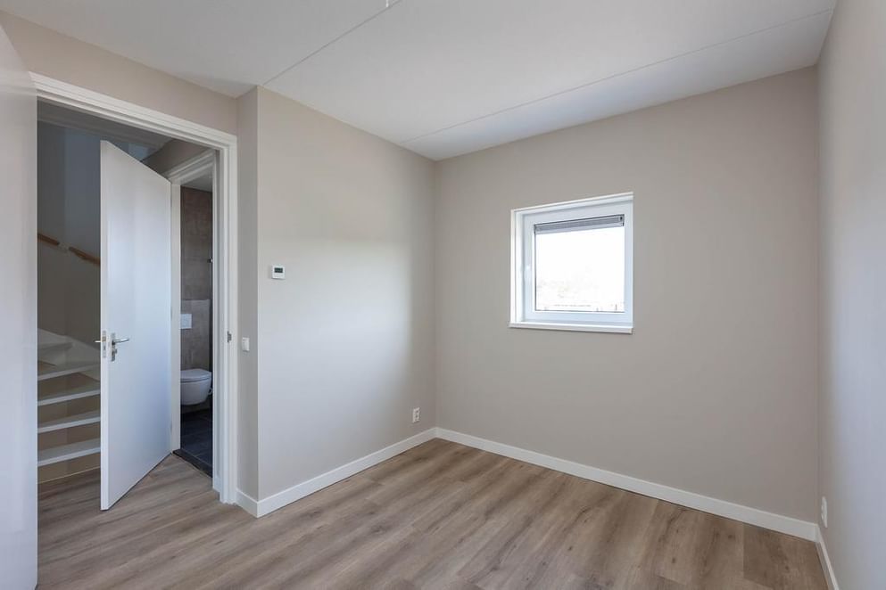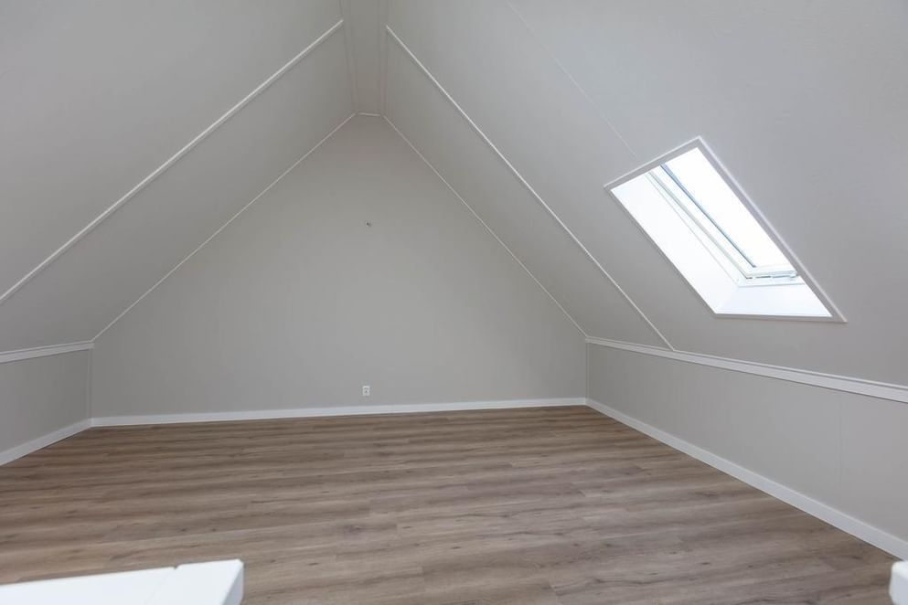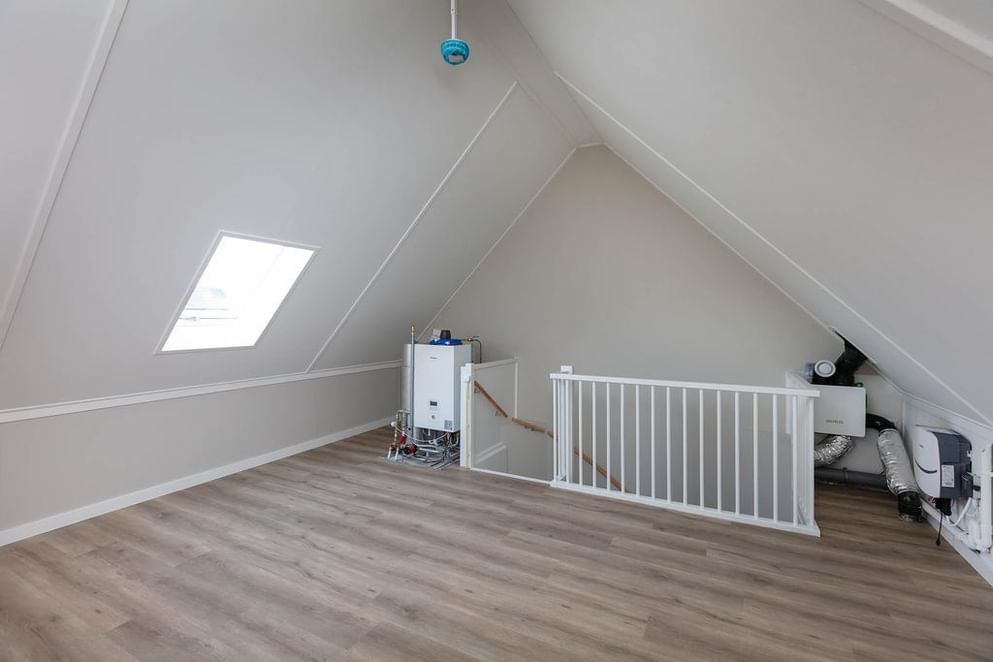 Via een vaste trap bereik je de ruime zolderverdieping. Deze open ruimte is voorzien van een dakraam en biedt volop mogelijkheden. Hier kunnen eenvoudig één of meerdere extra kamers worden gerealiseerd, bijvoorbeeld een vierde slaapkamer, een thuiswerkplek of een hobbyruimte. Tevens vind je hier de opstelplaats van de technische installaties, waaronder de lucht water warmtepomp en de witgoed aansluitingen.