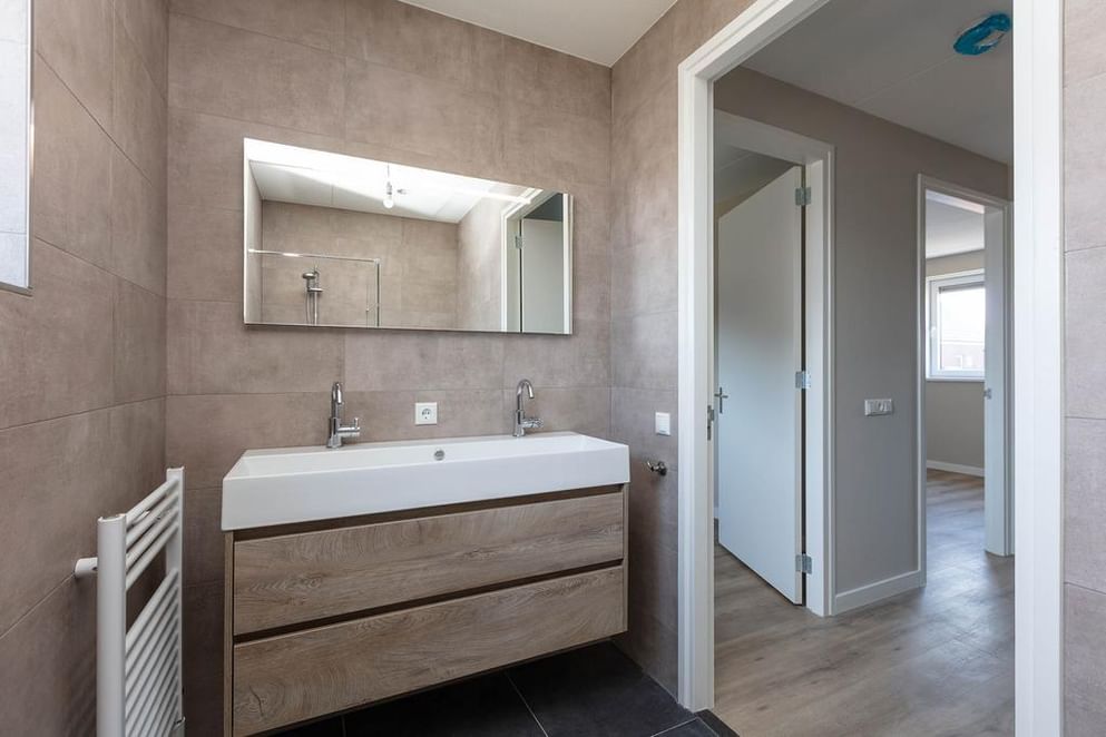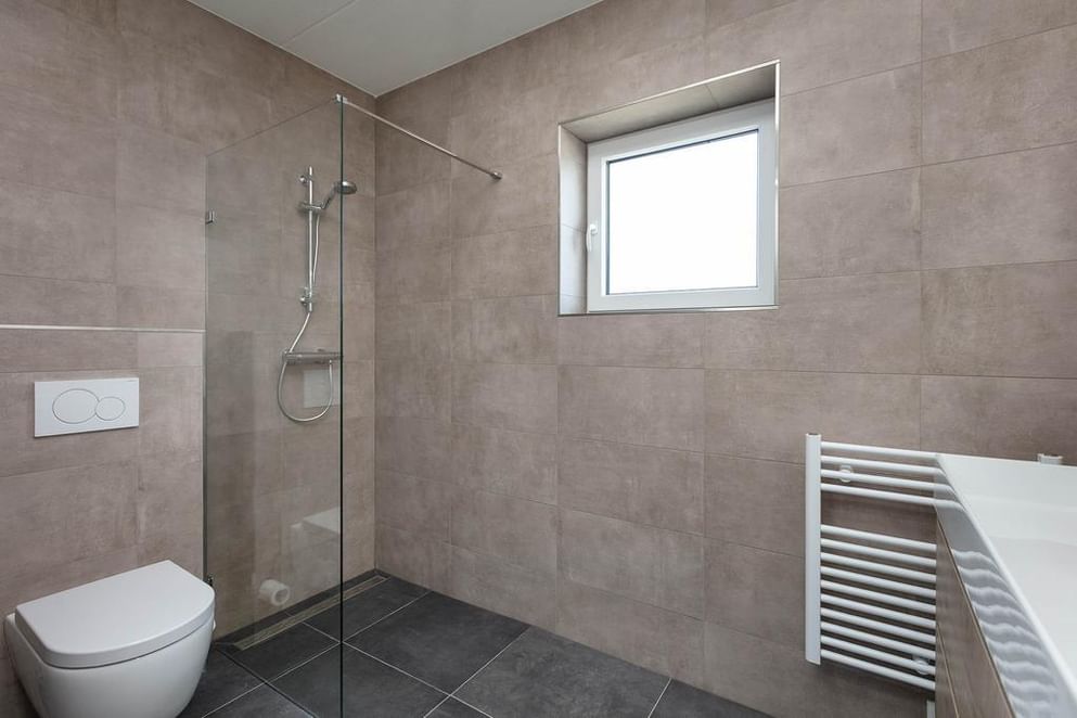 Eerste verdiepingDe overloop geeft toegang tot drie goed bemeten slaapkamers en een luxe badkamer. Deze is voorzien van een inloopdouche, een modern dubbel wastafelmeubel, een hangend toilet, vloerverwarming én een designradiator. Alles stijlvol afgewerkt met eigentijdse materialen.