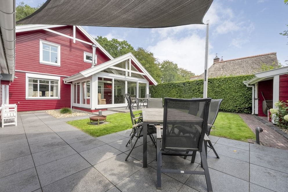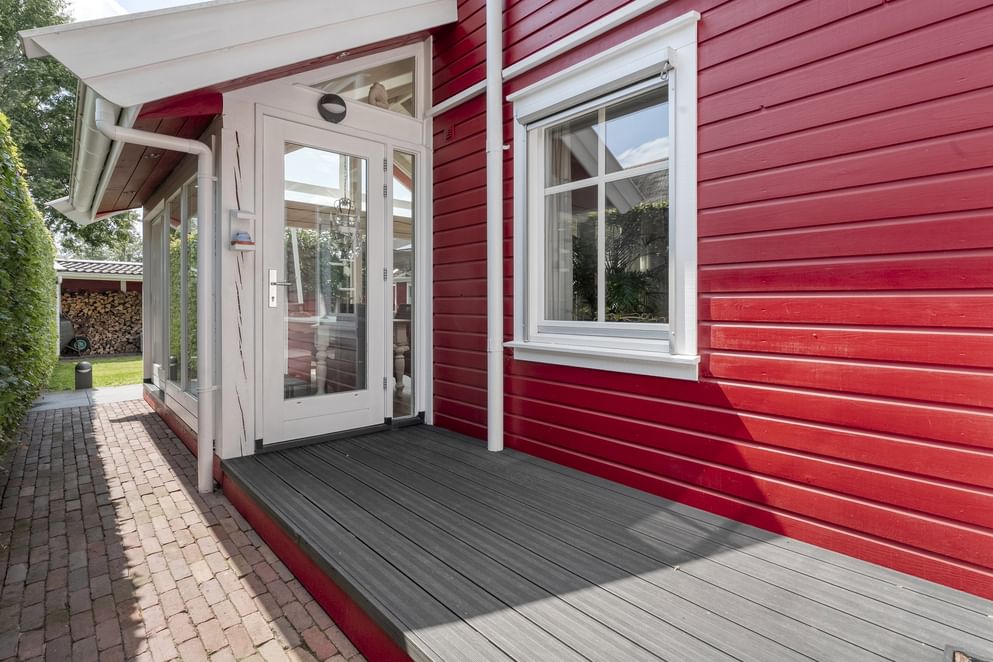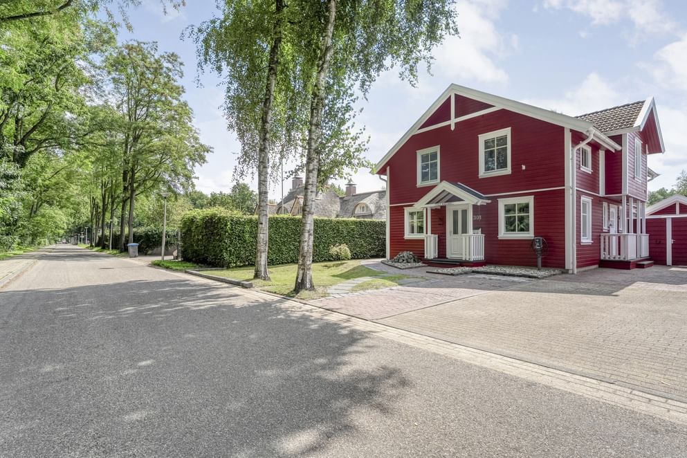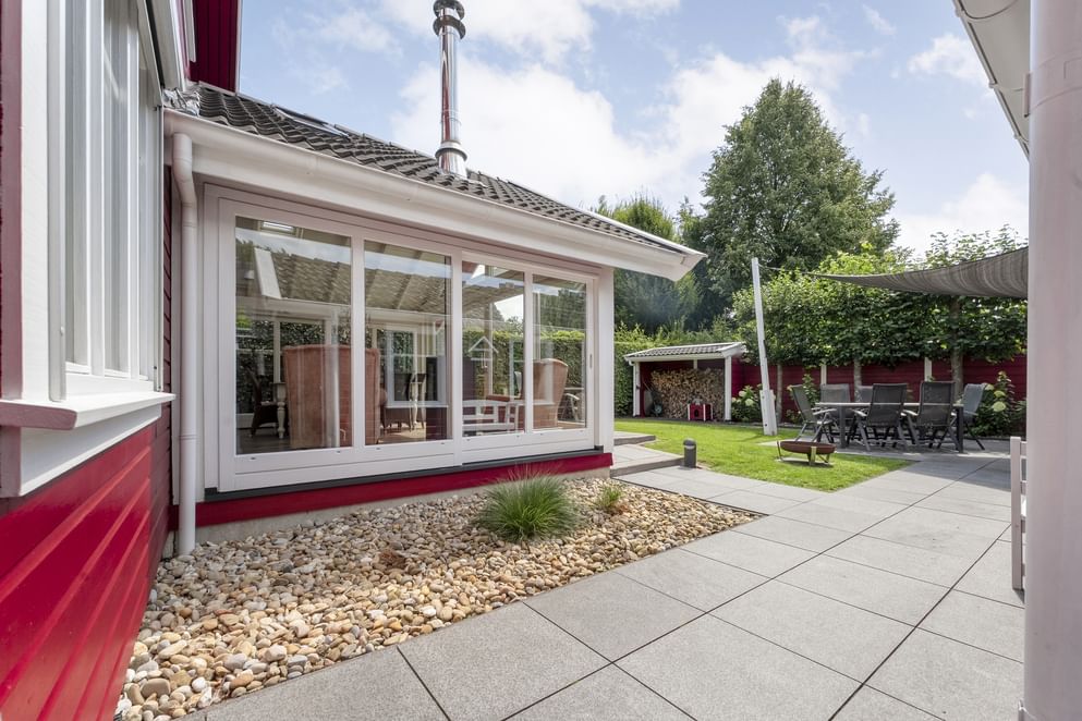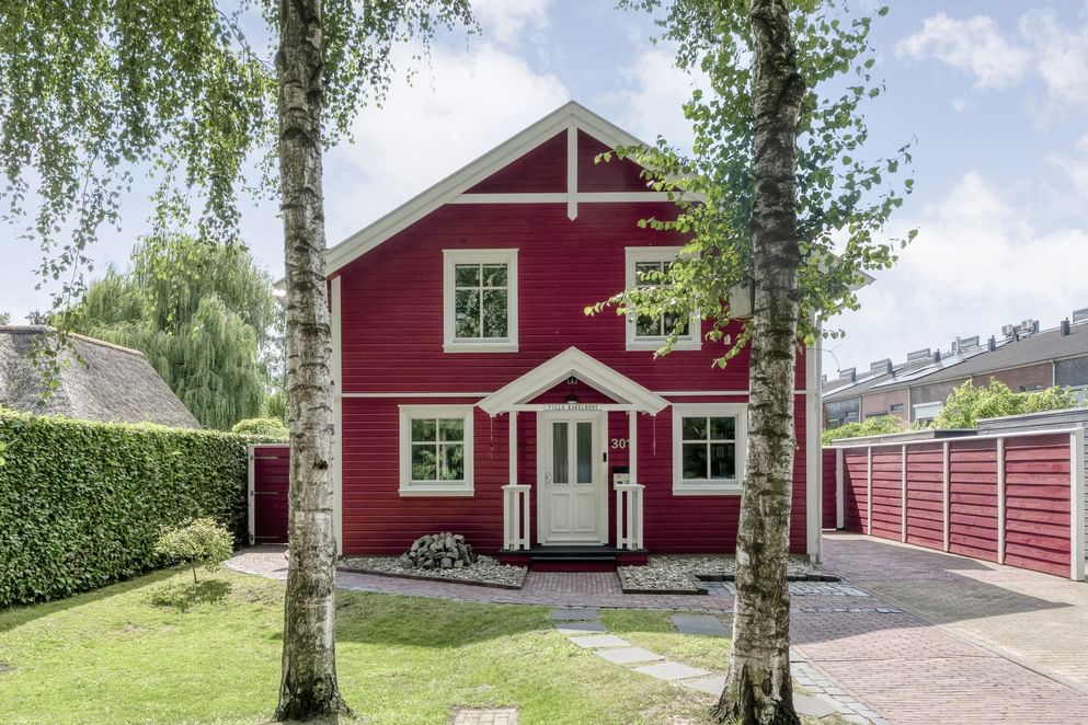 De rode houten gevel met witte accenten en symmetrische lijnen geven het huis direct een warme, charmante uitstraling die zich duidelijk onderscheidt van de omliggende bebouwing. Op de oprit is ruimte voor meerdere auto's en bevindt zich bovendien een laadpaal, ideaal voor elektrisch rijden. De woning is daarnaast uitgerust met 32 zonnepanelen en beschikt over energielabel A, wat bijdraagt aan een lage energierekening en een duurzaam wooncomfort.