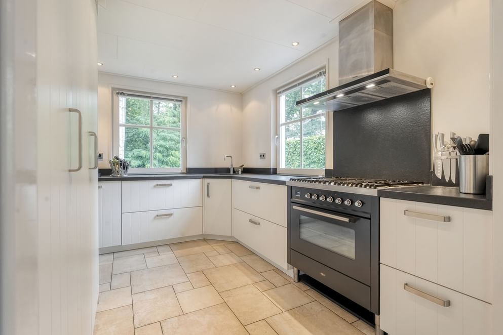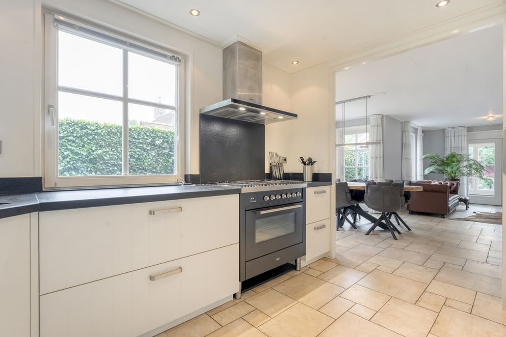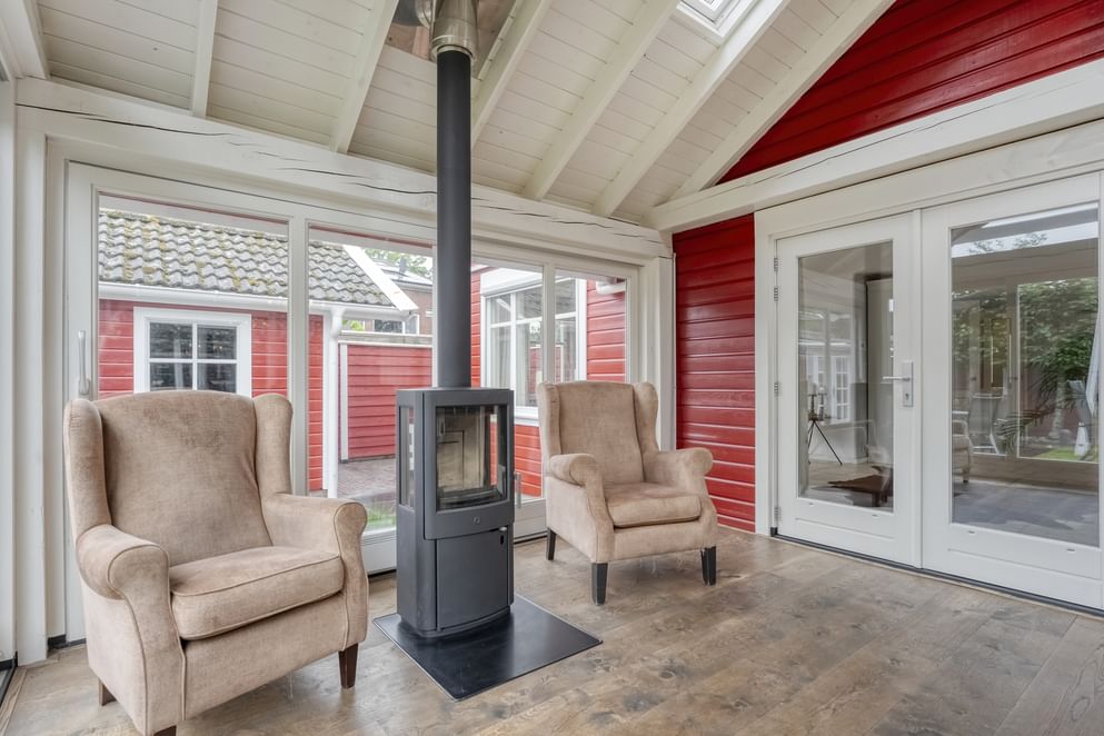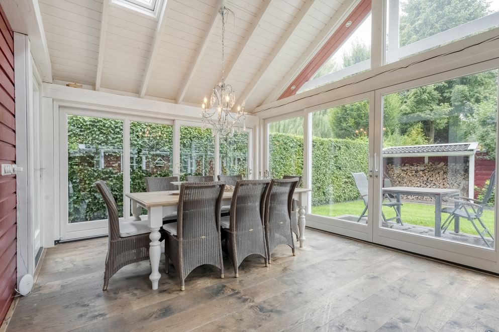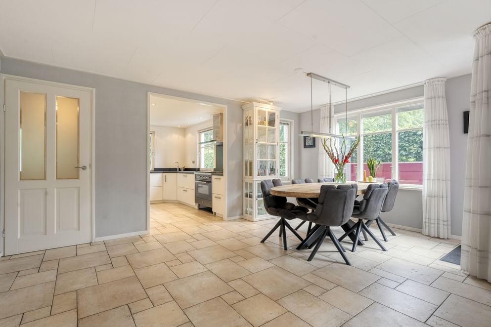 De eetkamer sluit aan op de keuken, deze is voorzien van een grote koelkast, gasfornuis met wokbrander, afzuigkap, Quooker en vaatwasser. De keuken heeft een praktische indeling en biedt opbergruimte. Aan de achterzijde van de woonkamer bieden openslaande deuren toegang tot een riante tuinkamer (2017). Deze ruimte is voorzien van een houtkachel, een dakraam en maar liefst drie schuifpuien naar de tuin, waardoor je hier het hele jaar door comfortabel kunt genieten van het buitengevoel.