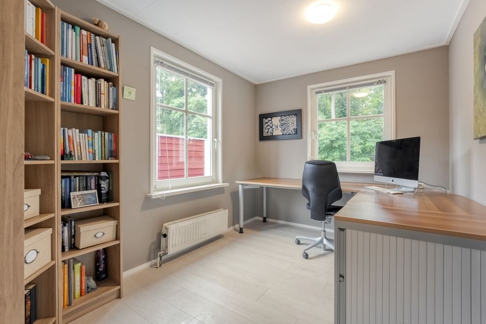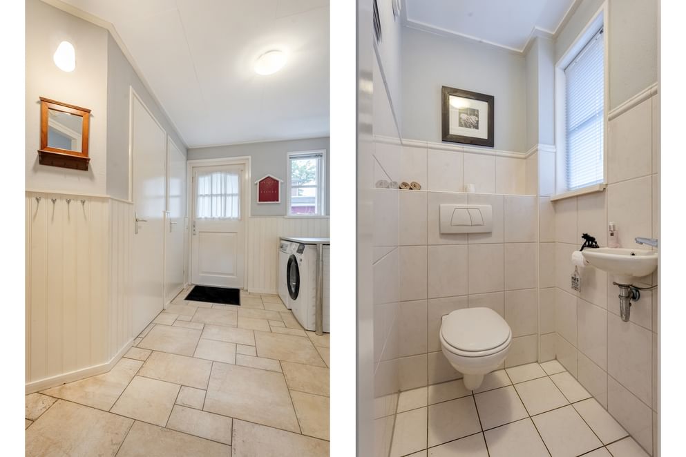 Via de woonkamer loop je door naar het rechtergedeelte van de woning. Hier bevindt zich de bijkeuken, met opstelling voor wasmachine en droger, toegang tot een toiletruimte, de kelder en de stookruimte. Vanuit de bijkeuken is er tevens een deur naar de andere zijkant van de woning. Tot slot biedt dit gedeelte ook toegang tot een extra kamer, die ideaal te gebruiken is als kantoor aan huis of extra slaapkamer. De gehele begane grond is voorzien van comfortabele vloerverwarming.