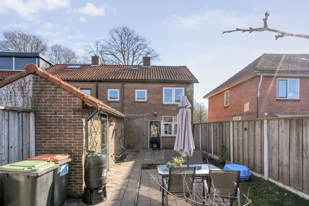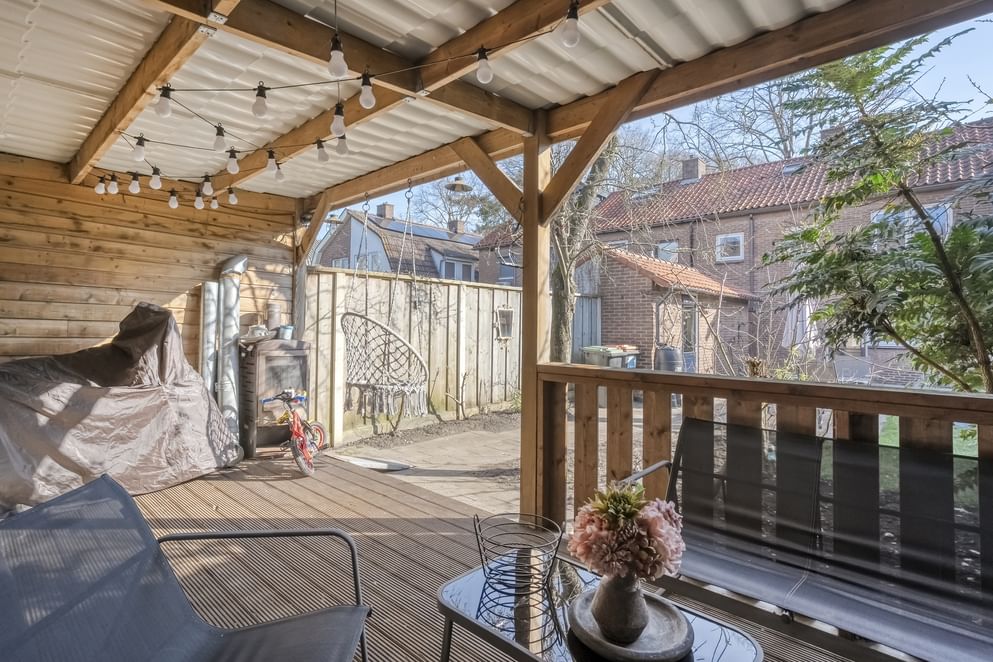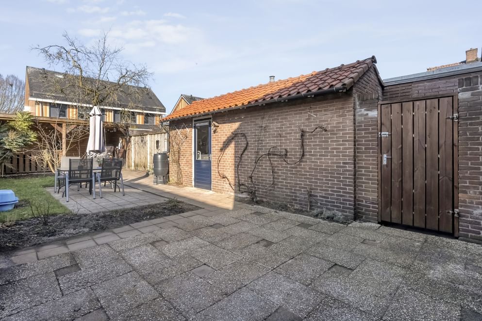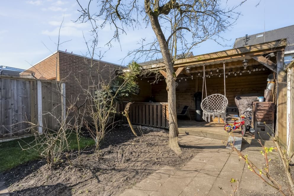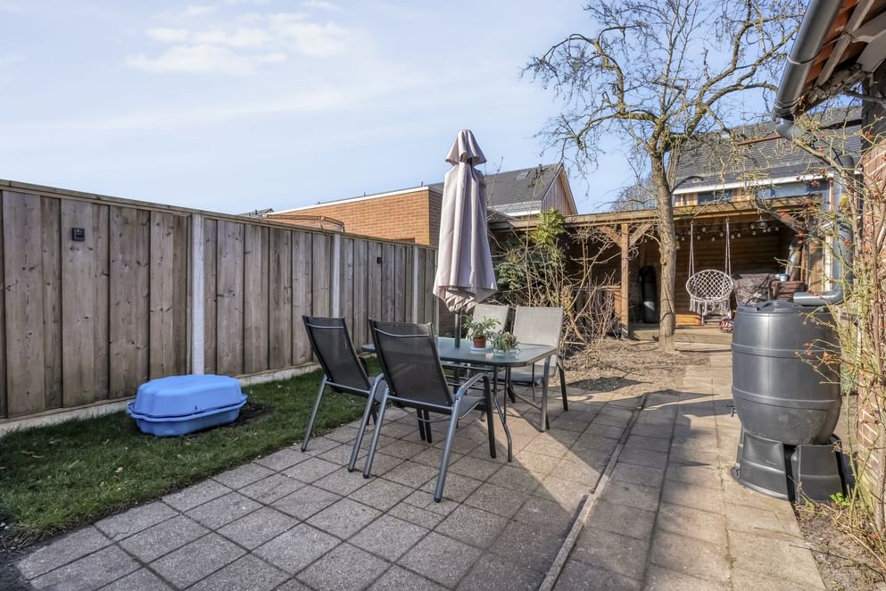 De achtertuin vormt een fijne verlenging van het wooncomfort. Dankzij de overkapping ontstaat er een extra buitenruimte waar je vrijwel het hele jaar door kunt genieten van het buitenleven. De tuin beschikt daarnaast over meerdere fruitbomen, waaronder appel-, druif- en pruimenbomen, die zorgen voor een groene en levendige sfeer én een eigen oogst. Ook is er een praktische achterom aanwezig.