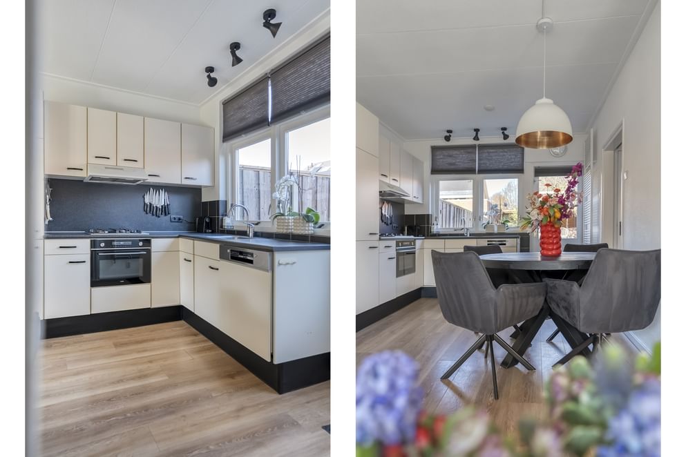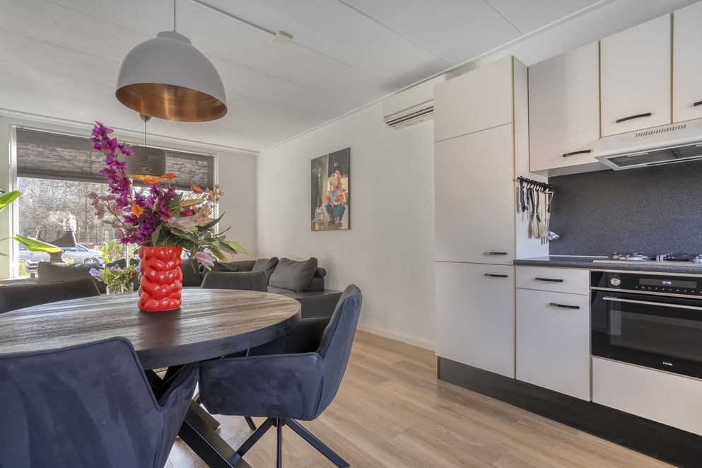 Via de entree kom je in de hal waar zich een apart toilet en een praktische kelderkast bevinden. Vanuit hier loop je door naar de open keuken die direct in verbinding staat met de woonkamer. De keuken is voorzien van diverse inbouwapparatuur, waaronder een combi-oven, een 5-pits gasfornuis, een afzuigkap en een spoelbak. Vanuit de keuken is er een deur naar de tuin, wat zorgt voor een prettige verbinding tussen binnen en buiten. De woonkamer vormt samen met de keuken een sfeervolle leefruimte en wordt extra gezellig door de gashaard. Voor extra comfort is de begane grond voorzien van een airconditioning, waardoor het binnenklimaat het hele jaar door aangenaam blijft.