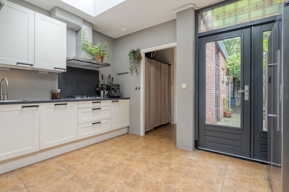 Bij binnenkomst betreed je een entree met de trapopgang naar de eerste verdieping en toegang tot de woonkamer. De woonkamer is verassend ruim en biedt dankzij de grote raampartijen aan de voorzijde veel natuurlijk licht. De bovenramen zijn voorzien van karakteristiek glas-in-lood, wat zorgt voor een warme en sfeervolle uitstraling. De ruimte is praktisch in te delen en biedt volop mogelijkheden voor meerdere zitgedeeltes. Aan de achterzijde van de woning bevindt zich de keuken. Deze is voorzien van diverse inbouwapparatuur en dankzij de lichtkoepels en tuindeuren is ook hier veel daglicht aanwezig. Vanuit de keuken is via de bijkeuken met witgoedaansluitingen de toiletruimte, de badkamer en de achtertuin bereikbaar. Het toilet is voorzien van een wandcloset met fontein en de badkamer is uitgerust met een douche en dubbele wastafel met meubel.