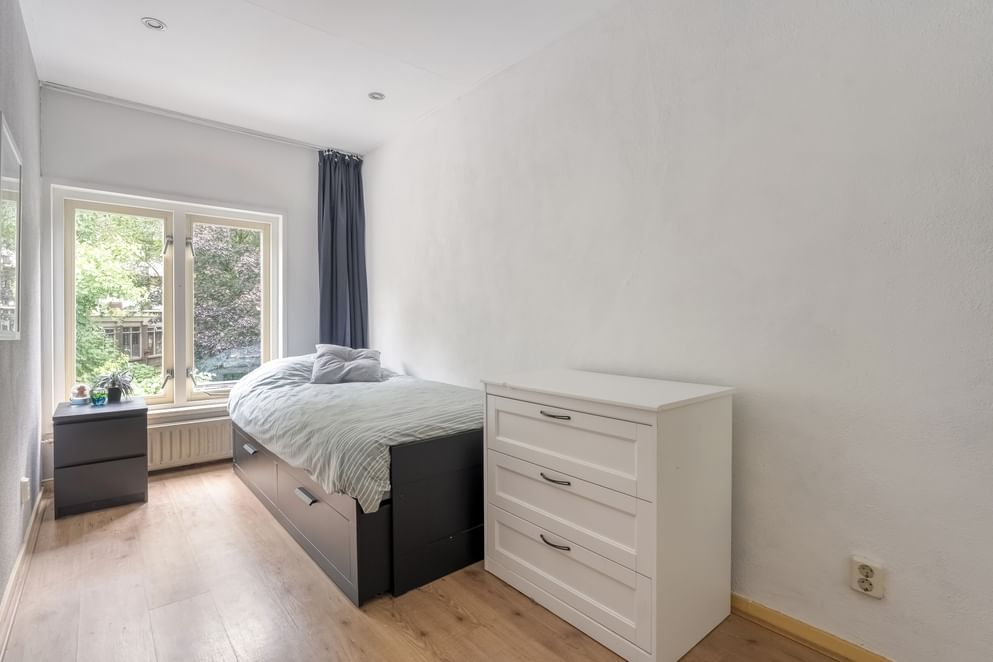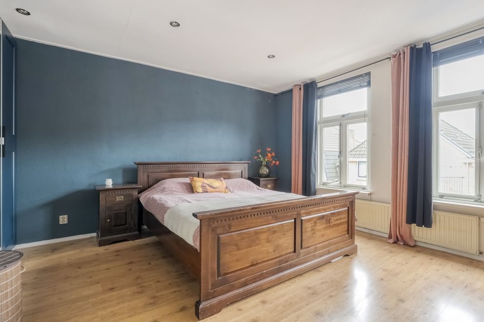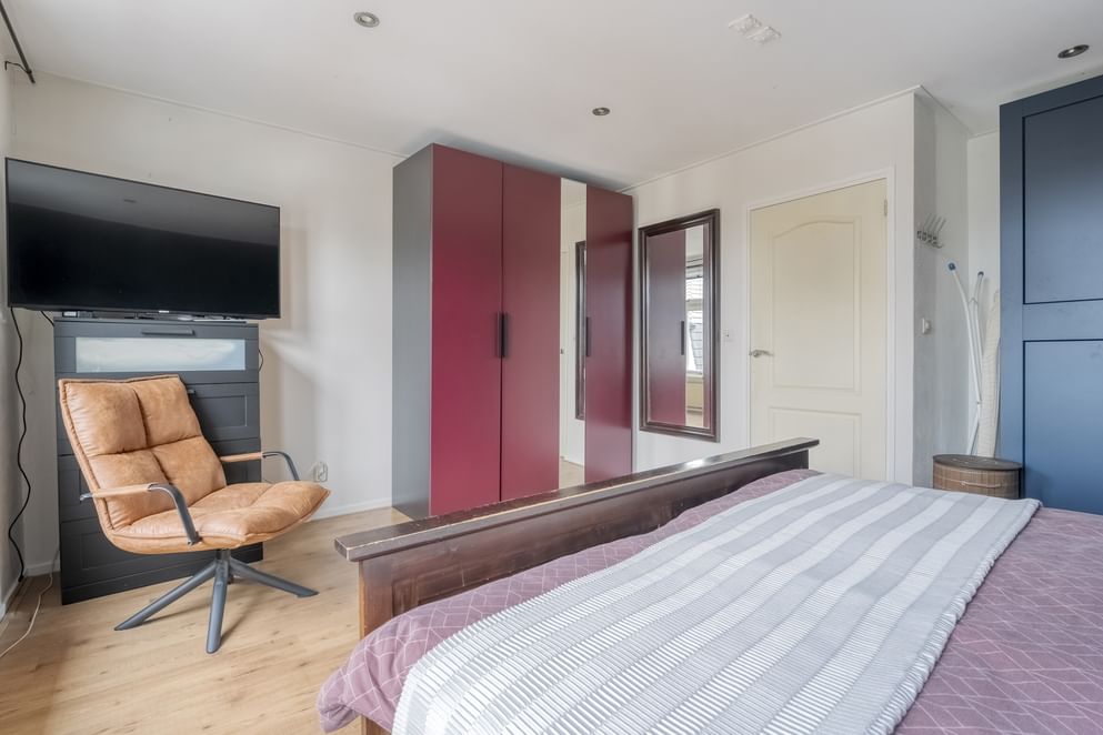 Vanuit de hal bereik je de overloop van de eerste verdieping. Hier bevinden zich drie slaapkamers. De hoofdslaapkamer ligt aan de voorzijde van de woning en beslaat de volledige breedte, wat zorgt voor een ruime en comfortabele ruimte. Alle slaapkamers zijn voorzien van grote raampartijen, wat zorgt voor een fijne lichtinval en een aangename sfeer in de kamers.