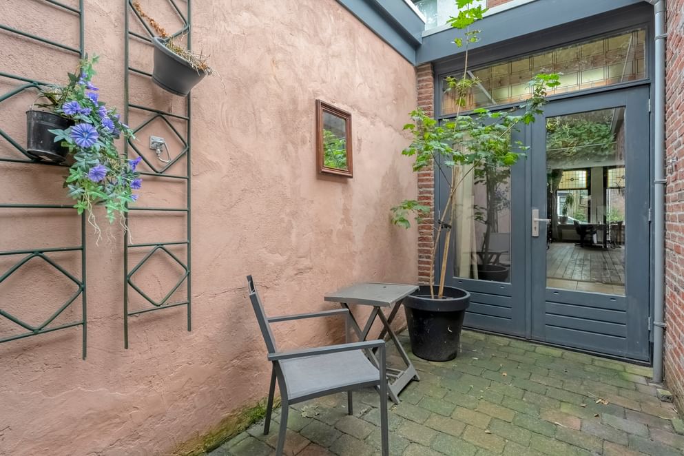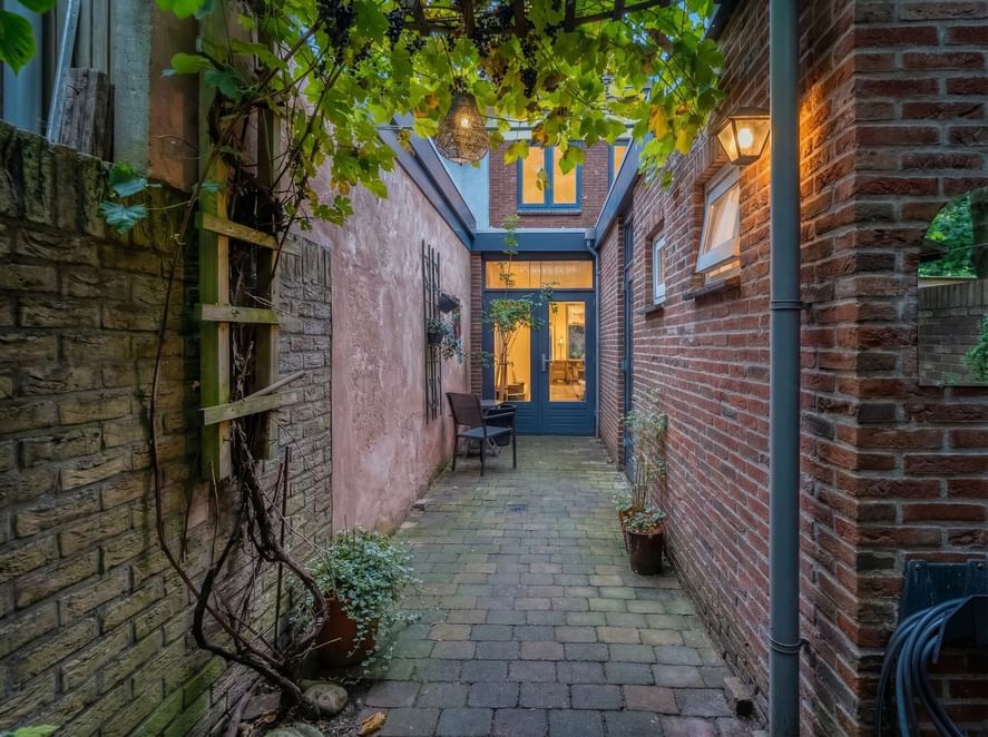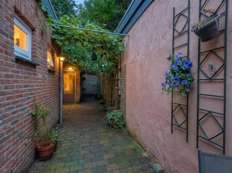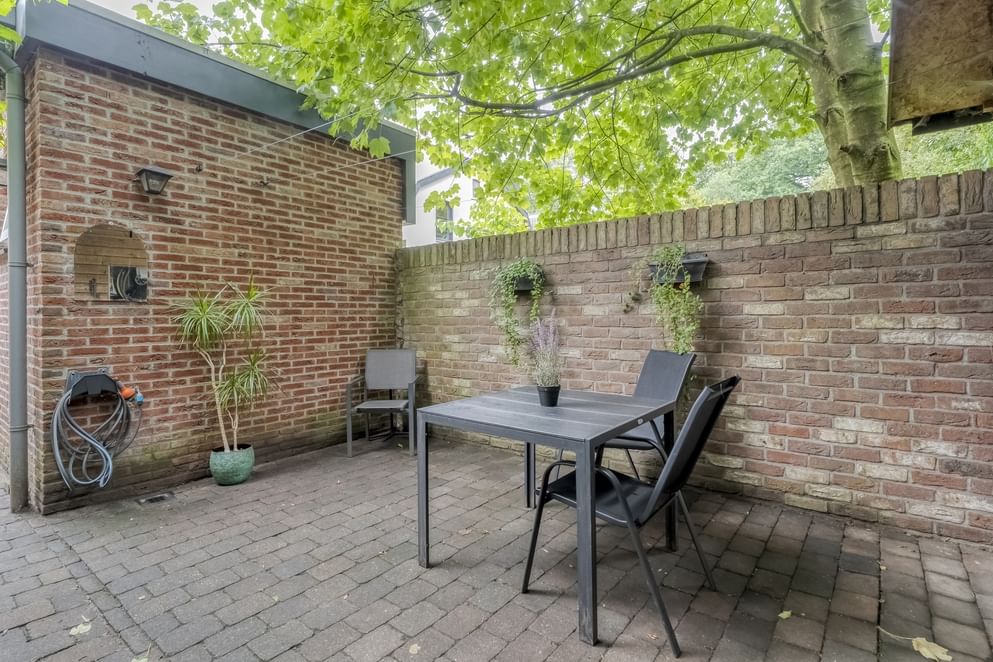 Achter de woning ligt een beschutte stadstuin. De tuin is bewust onderhoudsvriendelijk gehouden, waardoor je hier volop kunt genieten van de rust en het buitenzijn. De achterzijde van de tuin wordt omzoomd door een bomenrij, welke deels nieuw aangeplant wordt. Dit zorgt voor extra privacy, maar ook een groen, bijna parkachtig decor.