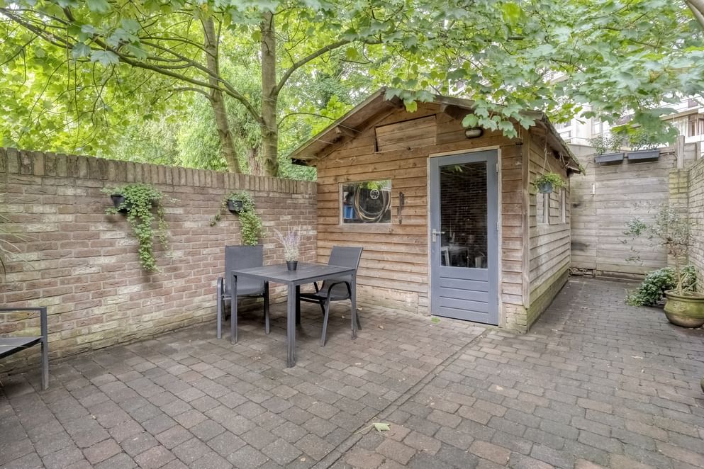 Achterin de tuin staat het tuinhuis, een veelzijdige plek die zich net zo makkelijk leent voor het opbergen van fietsen en tuingereedschap als voor een hobbyruimte, werkplek of rustige schuilplaats op een zomerse avond.