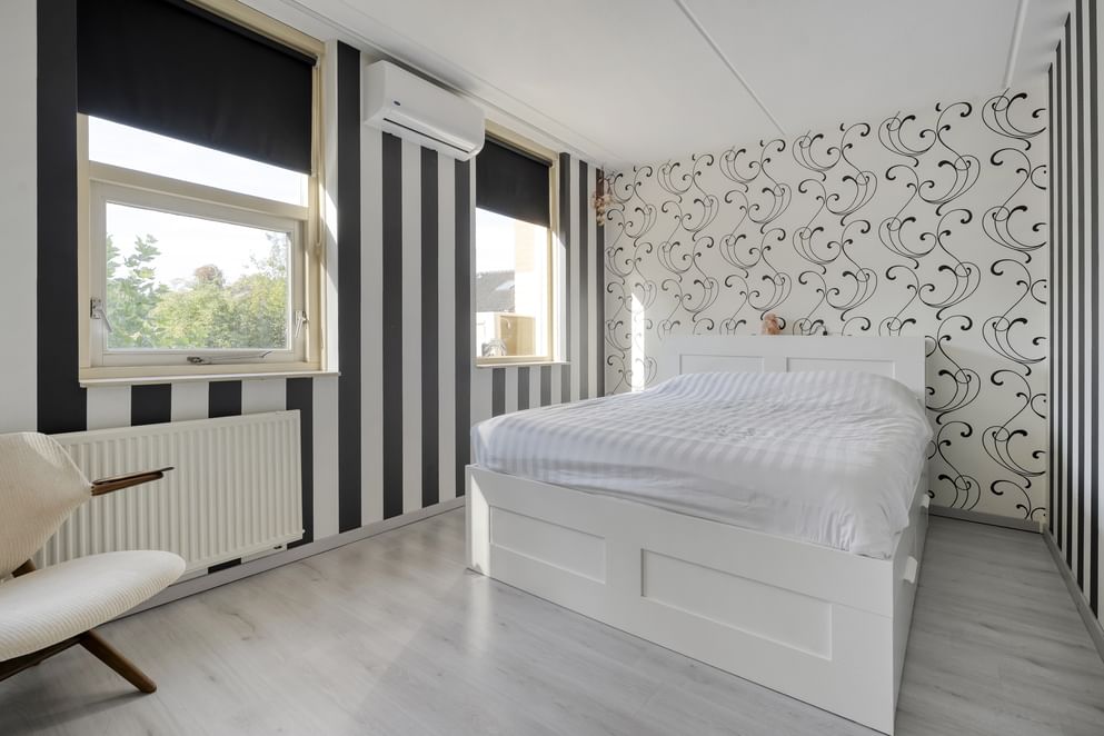 Je bereikt de eerste verdieping, waar zich verschillende slaapkamers bevinden. Aan de achterzijde van de woning tref je de master bedroom, een ruime kamer met drie raampartijen die voor veel natuurlijk licht zorgen. Daarnaast is deze kamer uitgerust met een airco, voor optimaal comfort tijdens warme dagen. Aan de voorzijde van de woning vind je een tweede slaapkamer, evenals een multifunctionele ruimte die perfect kan dienen als derde slaapkamer of als kantoor. De geheel betegelde badkamer is functioneel voor wat betreft de indeling en beschikt over een douche, ligbad, toilet, wastafelmeubel en mechanische ventilatie.