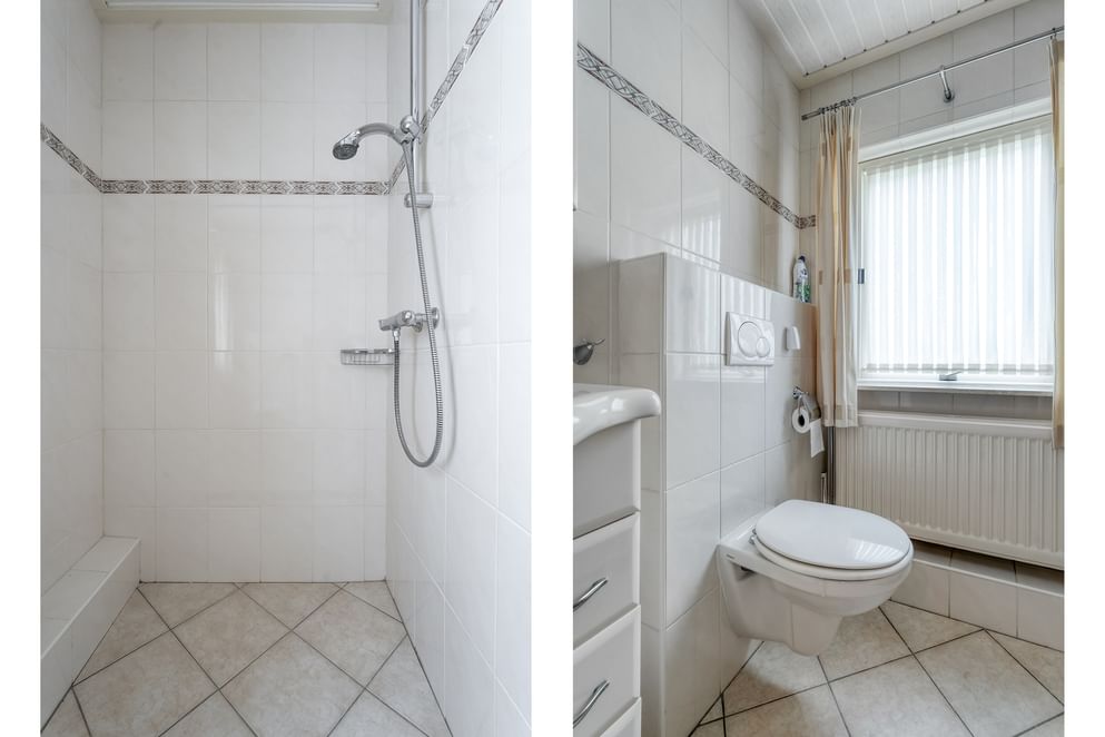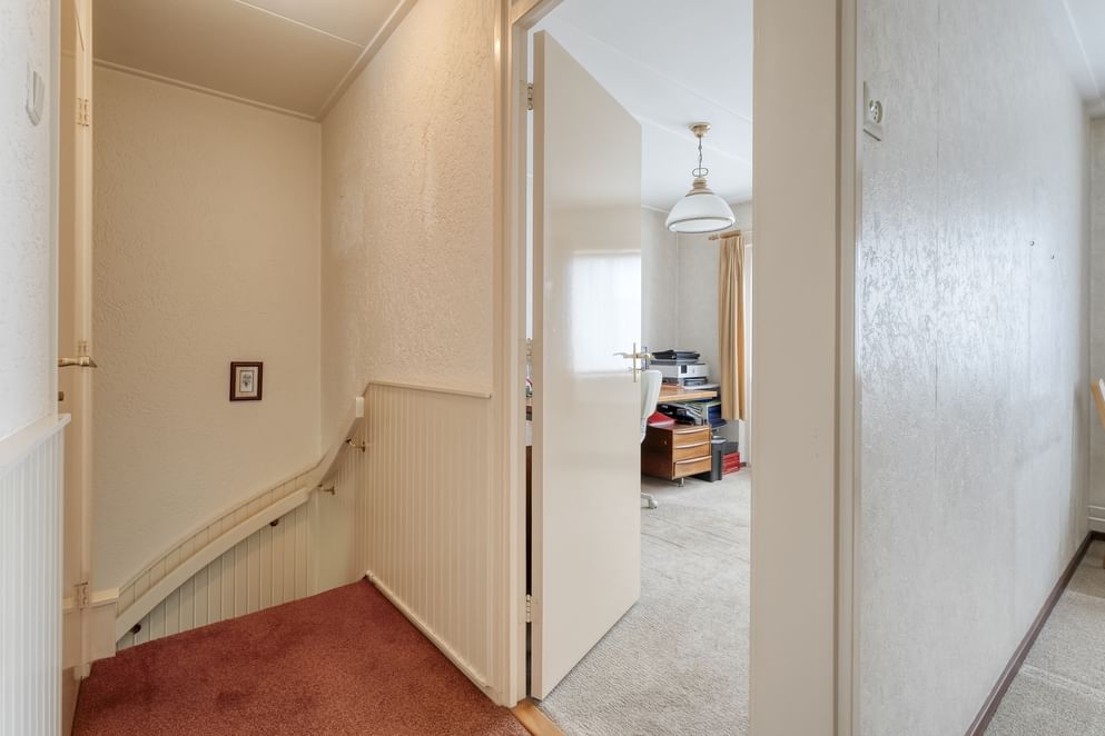 Via de vaste trap bereik je de eerste verdieping met een overloop die toegang geeft tot drie kamers. Hier is genoeg plek om te slapen, te werken of je eigen hobby’s vorm te geven. De badkamer is daarnaast praktisch en compleet ingericht met een wastafelmeubel, designradiator, toilet en een inloopdouche.