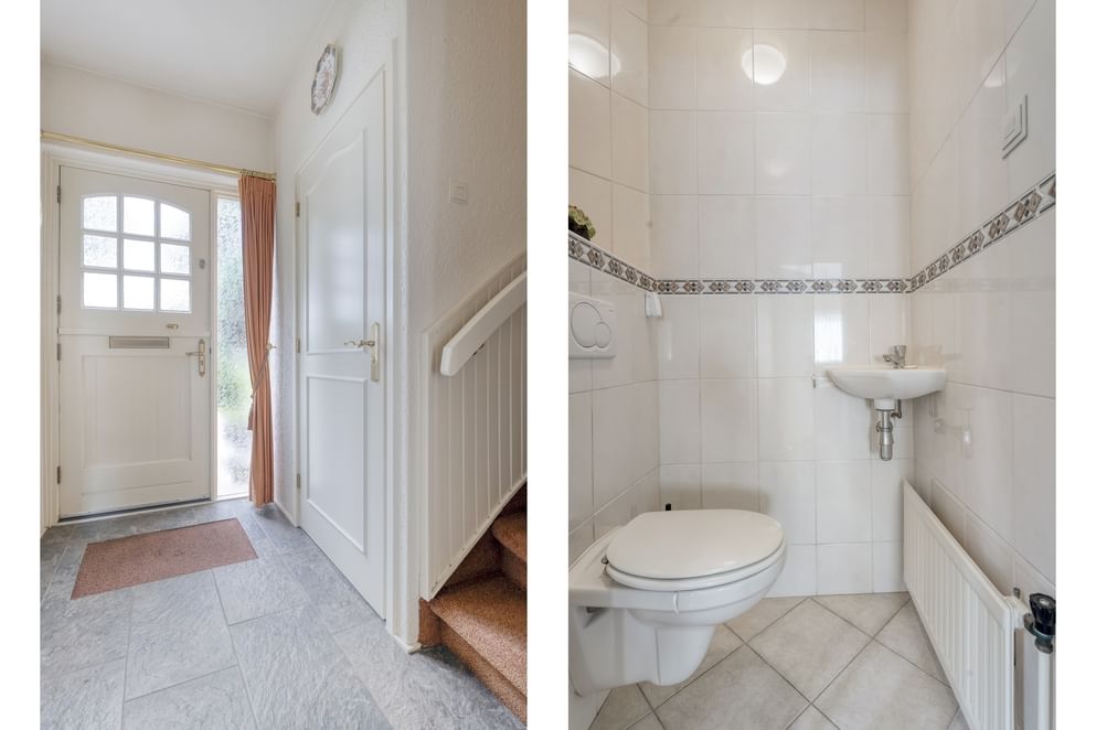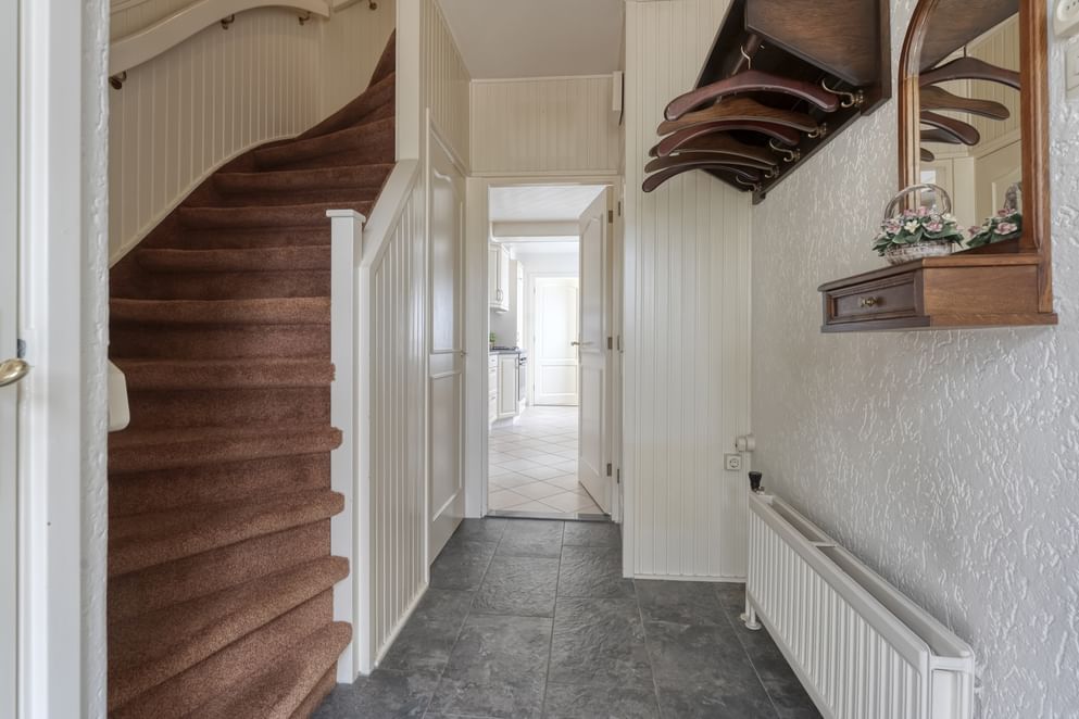 Bij binnenkomst stap je de hal binnen, die is voorzien van de trapopgang naar de eerste verdieping, de meterkast, een toilet met fonteintje en een handige trapkast. Vanuit hier loop je door naar de ruime woonkamer, waar een fijne zithoek en een eethoek elkaar aanvullen. De woonkamer staat in directe verbinding met de keuken, die veel werk- en kastruimte biedt en is uitgerust met een nieuwe vaatwasser. Vanuit de keuken heb je toegang tot de achterportaal en de bijkeuken, waar aansluitingen zijn voor de wasmachine en droger. Deze ruimtes leiden je vervolgens naar de achtertuin.