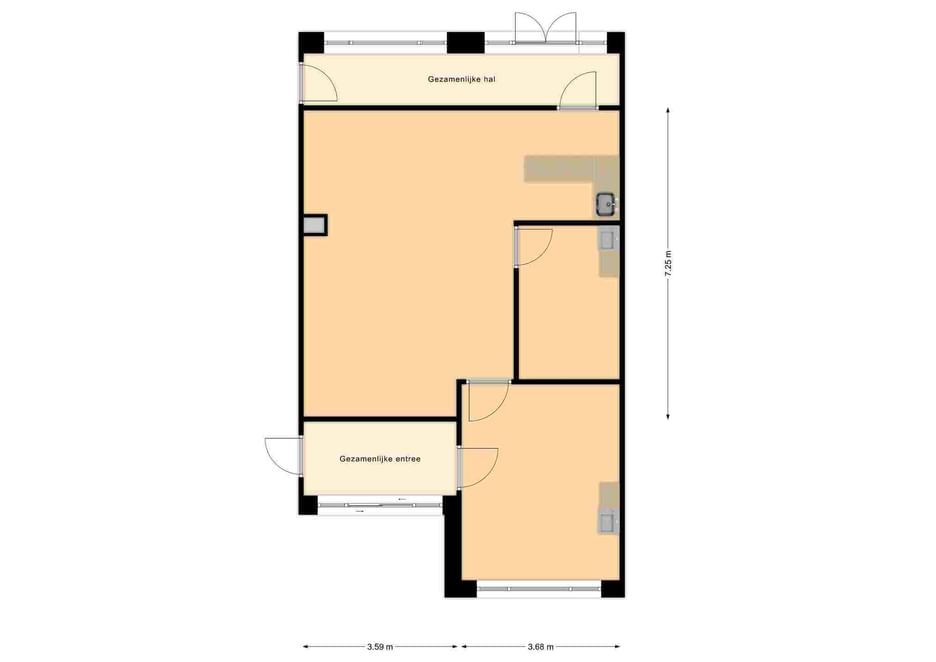 Entree, zaal v.v. balie/pantry, 2x behandelruimte v.v. wastafel, tweede entree.